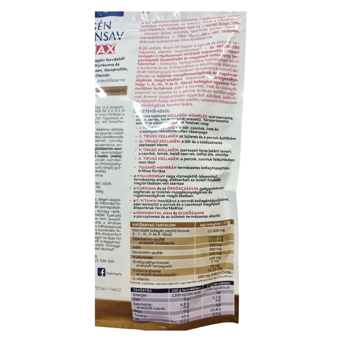 A Kollagén & Hyaluronsav Intense Max italpor emelt dózisban tartalmazza a porcok és ízületek fontos építőelemeit, köztük 5 különféle forrásból származó kollagén peptideket (I., II., III., V. és X. típus), tojáshéj membránt, glükózamint, kondroitint, MSM-et, hyaluronsavat, valamint a C-vitamint, amely hozzájárulhat a normál kollagénképződéshez és ezzel a porcok és csontozat megfelelő állapotának fenntartásához. A készítmény emellett tartalmaz hatóanyagot a Kurkuma (Curcuma longa) és az Ördögcsáklya (Harpagophytum procumbens) kivonatából, amelyek segíthetik az ízületek mozgékonyságának és rugalmasságának megőrzését. A termék természetes módon glutén- és laktózmentes, cukor-, színezék- és tartósítószer-mentes, kellemes meggy-koktél ízű italpor. Fogyasztása különösen javasolt idősebbeknek és fokozott fizikai aktivitás esetén az ízületek, porcok és csontok étrendi támogatására.