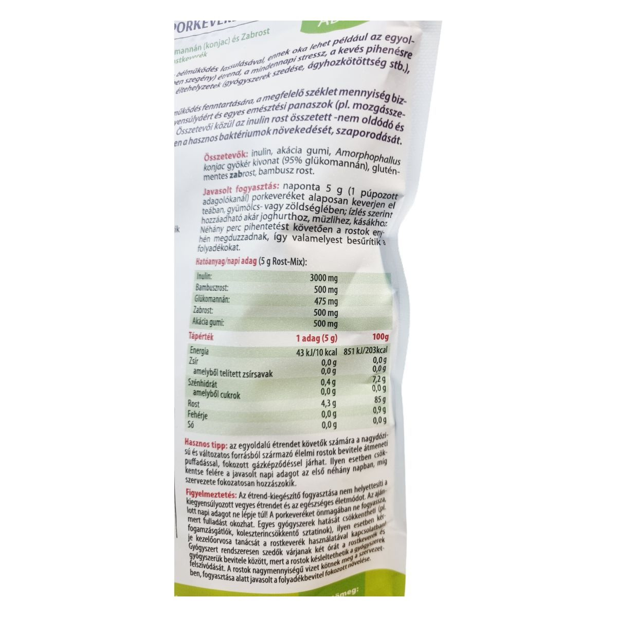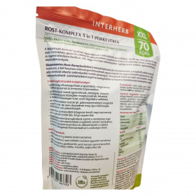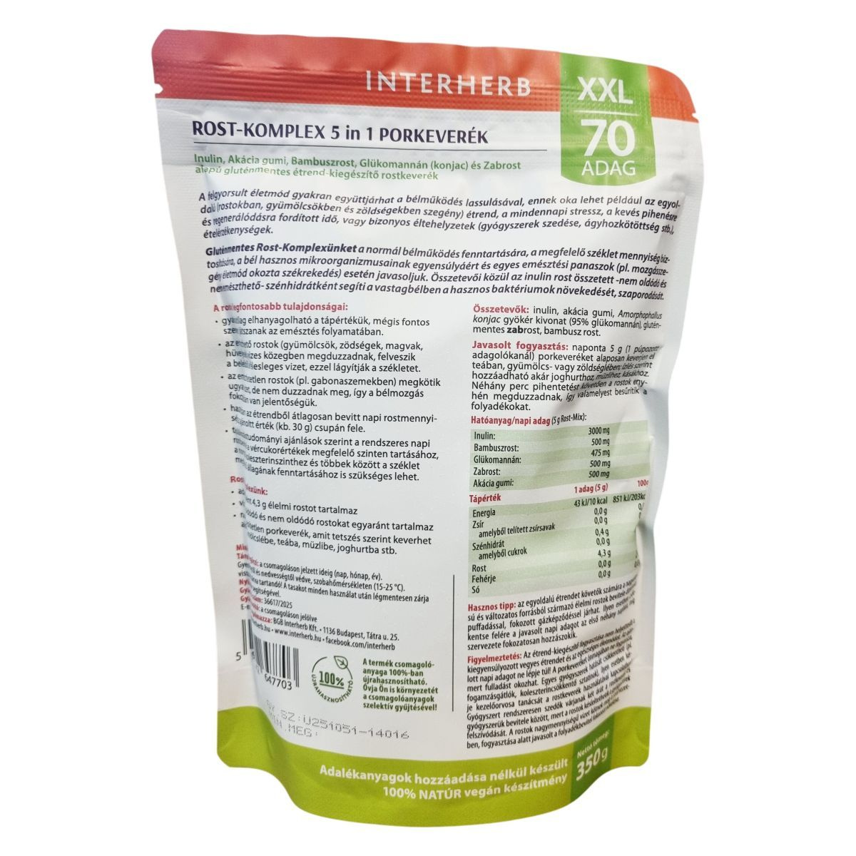 Az Interherb Rost-Komplex 5in1 rostkeverék az inulin, akácia gumi, bambuszrost, glükomannán (konjac) és zabrost kombinációján alapuló természetes, adalékanyagoktól mentes étrend-kiegészítő. A termék hozzájárulhat a normál bélműködés fenntartásához, a megfelelő székletmennyiség biztosításához és a bélflóra egyensúlyához, különösen mozgásszegény életmód esetén vagy olyan élethelyzetekben, amikor a bélműködés lassulhat. Az inulin komplex rostként segítheti a vastagbél hasznos baktériumainak növekedését. A rostok vízmegkötő, lágyító és bélmozgást fokozó hatásuk miatt támogathatják az emésztési folyamatokat. A hazai átlagos rostbevitel elmaradhat az ajánlott napi 30 grammtól, ezért a termék fokozatos, változatos rostfogyasztásban segítheti a kiegyensúlyozott táplálkozást. Natúr, ízesítetlen porkeverék, amely könnyen adagolható és sokféle ételbe vagy italba keverhető, miközben 100%-ban vegán és gluténmentes. A csomagolás 100%-ban újrahasznosítható, ezzel támogatva a környezetvédelmet.