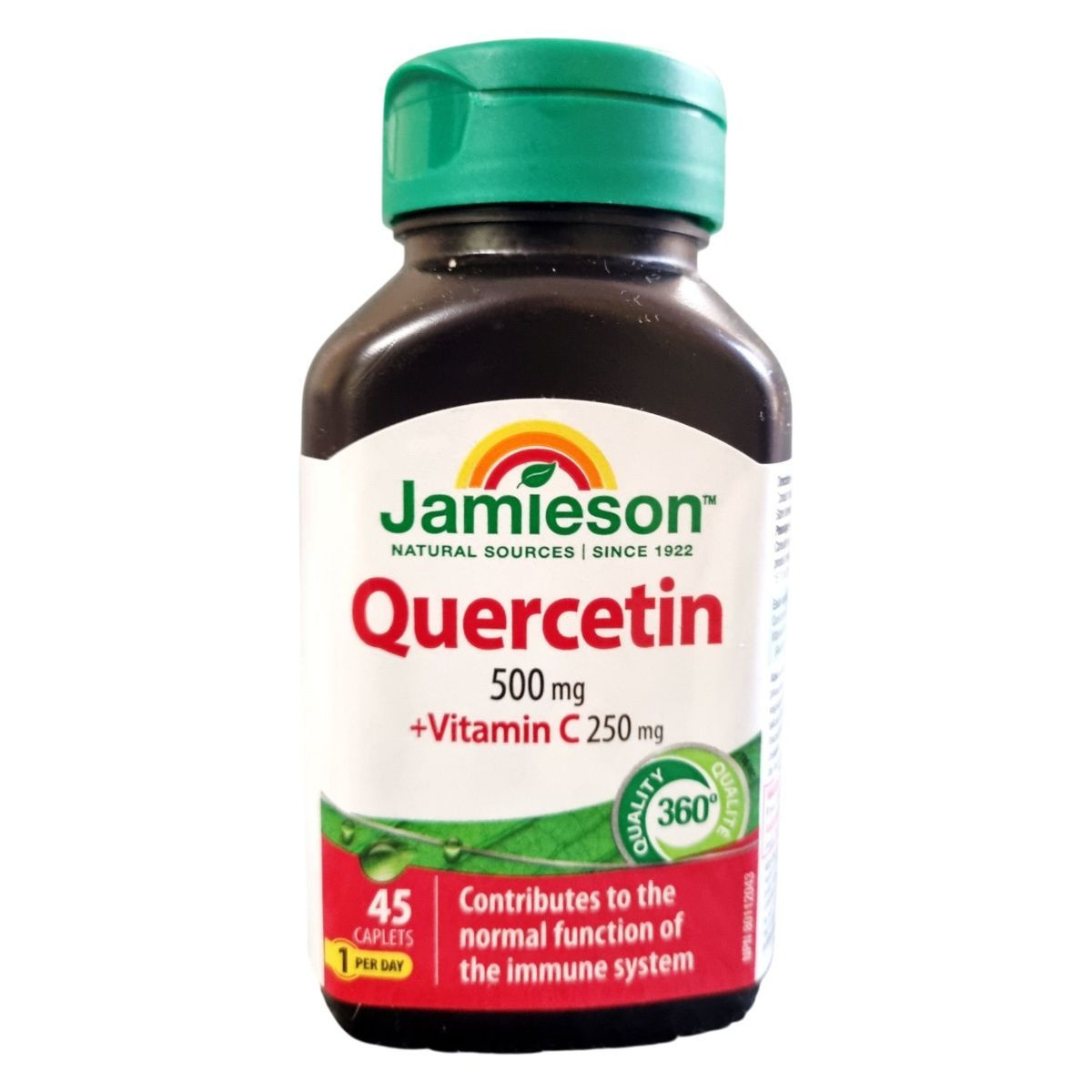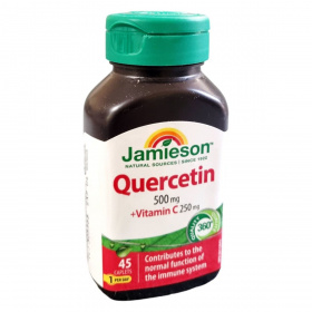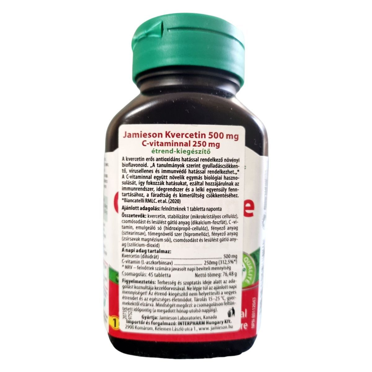 A Jamieson Quercetin étrend-kiegészítő 500 mg kvercetint és 250 mg C-vitamint tartalmaz, amelyek együttesen hozzájárulhatnak az immunrendszer normál működéséhez. A kvercetin erős antioxidáns hatású növényi bioflavonoid, amely gyulladáscsökkentő, vírusellenes és immunvédő hatással rendelkezhet. A C-vitamin segíthet a fáradtság és kimerültség csökkentésében, valamint az idegrendszer és a lelki egyensúly fenntartásában. A termék vegetáriánus étrendbe illeszthető, és mentes a GMO-k, só, cukor, keményítő, glutén, laktóz, valamint mesterséges színezékek, ízesítők és tartósítószerek hozzáadásától. A terméket Kanadában gyártják, és a minőségét a 360° minőségbiztosítási rendszer garantálja.