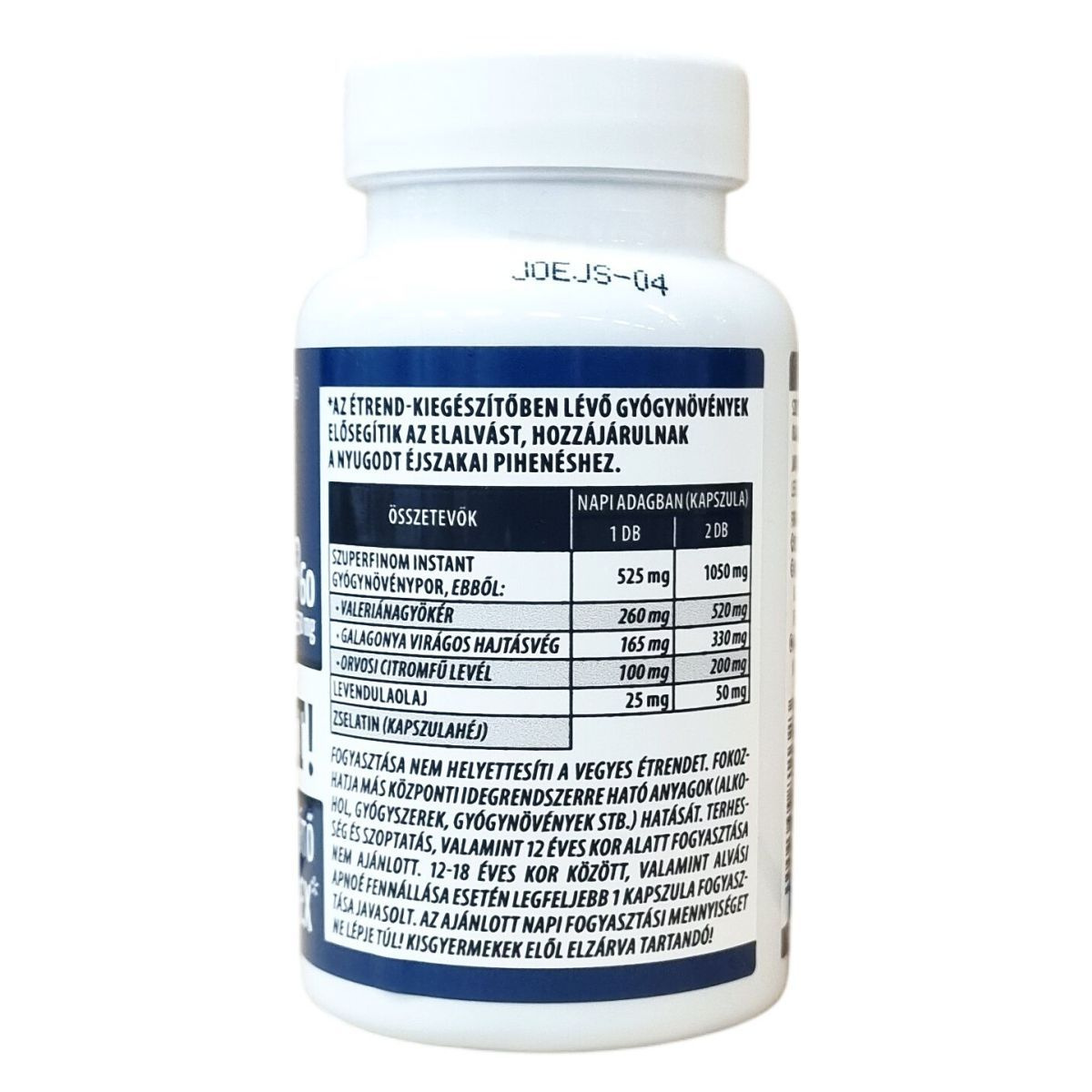 A termék szuperfinom instant gyógynövénypor és illóolajat tartalmazó étrend-kiegészítő kapszula, amely elsősorban lefekvés előtt, bő folyadékkal vagy teaként fogyasztható, akár mézbe, turmixba, joghurtba vagy olajba keverve. Az összetevők között található valerianagyökér, galagonya virágos hajtásvég, orvosi citromfű levél és levendulaolaj, melyek elősegíthetik az elalvást és hozzájárulhatnak a nyugodt éjszakai pihenéshez. Fontos, hogy a termék fogyasztása nem helyettesíti a változatos és kiegyensúlyozott étrendet és egészséges életmódot. A kapszulák zselatinból készültek. Az ajánlott fogyasztási mennyiség betartása, valamint az egyéb, központi idegrendszerre ható anyagokkal való együttes használat esetén körültekintés javasolt. A termék nem ajánlott terhesség és szoptatás alatt, továbbá 12 éves kor alatt, valamint 12-18 éves korban vagy alvási apnoé esetén csökkentett mennyiség javasolt.