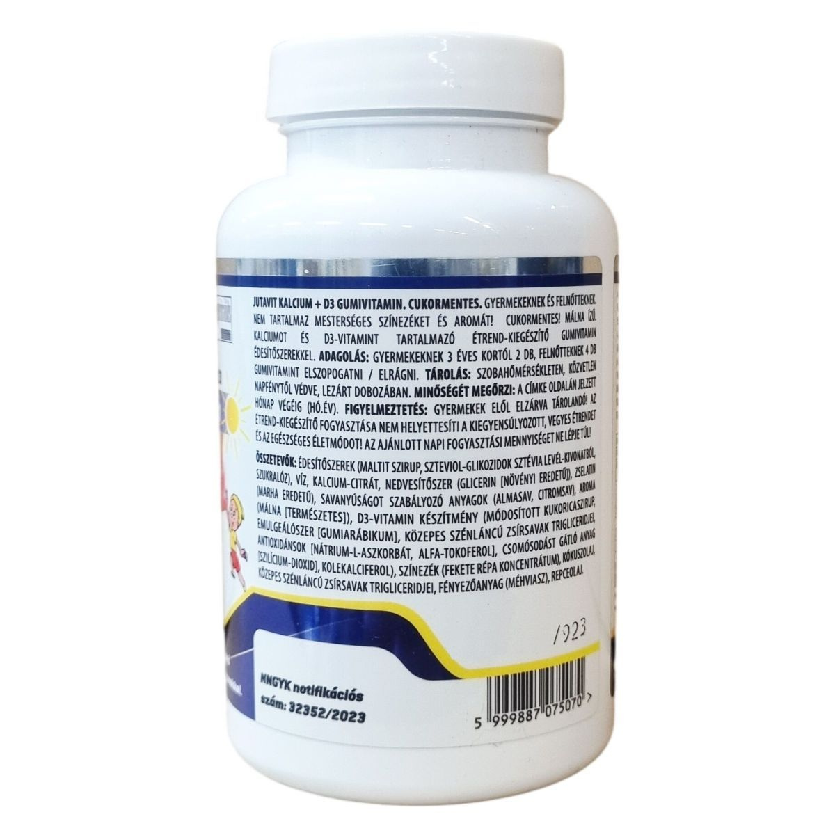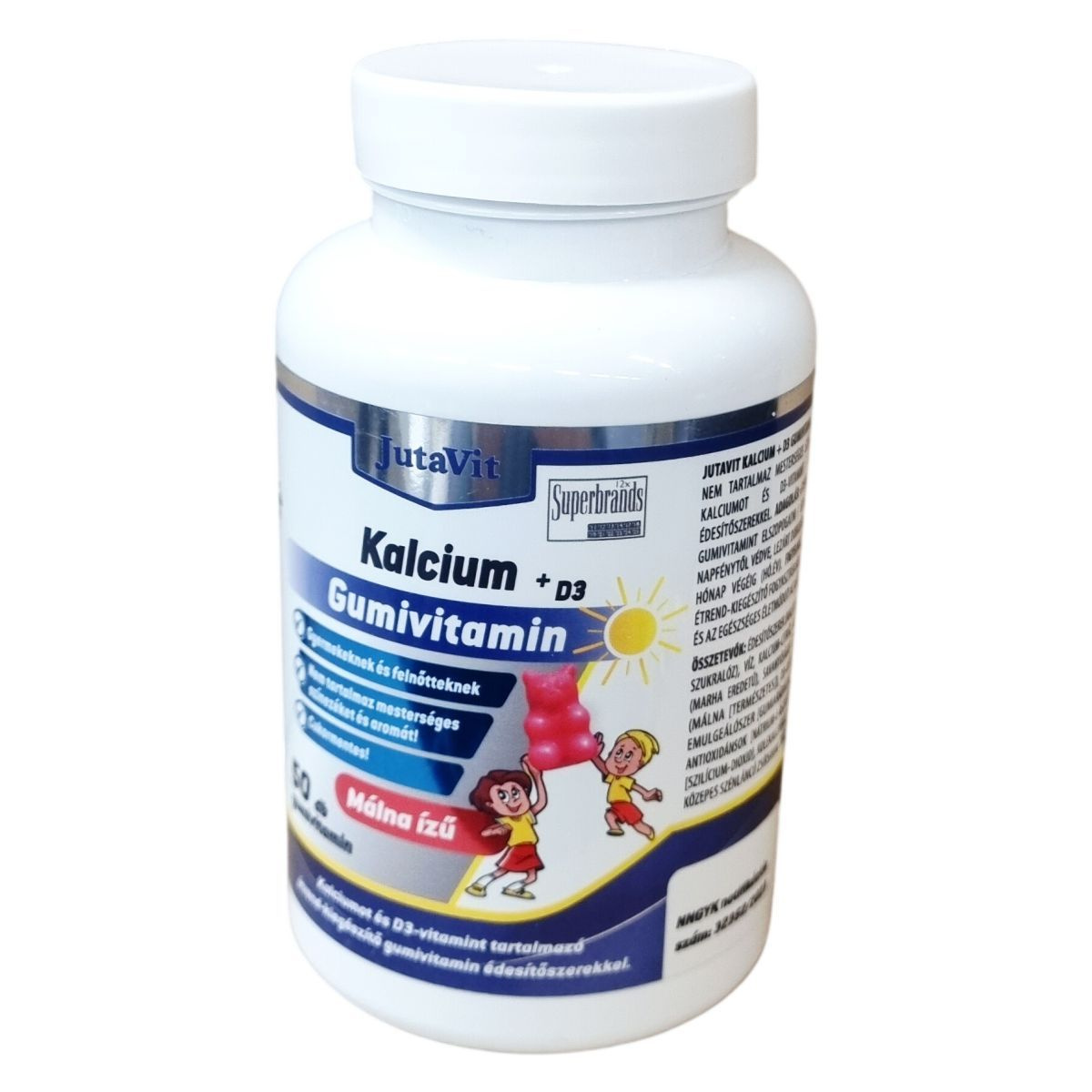 A JutaVit Kalcium + D3 gumivitamin édesítőszerrel készült, málna ízű, cukormentes termék, amely mesterséges színezéket és aromát nem tartalmaz. A fő hatóanyagok a kalcium és a D3-vitamin, amelyeket kalcium-citrát formájában és kolekalciferol néven találhatunk meg a készítményben. A termék zselatint is tartalmaz, mely marha eredetű. A gumivitamin stabilitását és minőségét számos adalékanyag biztosítja, mint például savanyúságot szabályozó anyagok, antioxidánsok és fényezőanyag. A termék a hivatalos notifikációs számmal rendelkezik, és gyermekeknek 3 éves kortól, illetve felnőtteknek ajánlott mennyiségben fogyasztható elszopogatva vagy elrágva. A készítményt célszerű szobahőmérsékleten, napfénytől védve tárolni, és gyermekek elől elzárva tartani. Fontos megjegyezni, hogy az étrend-kiegészítő nem helyettesíti a kiegyensúlyozott étrendet és az egészséges életmódot.
