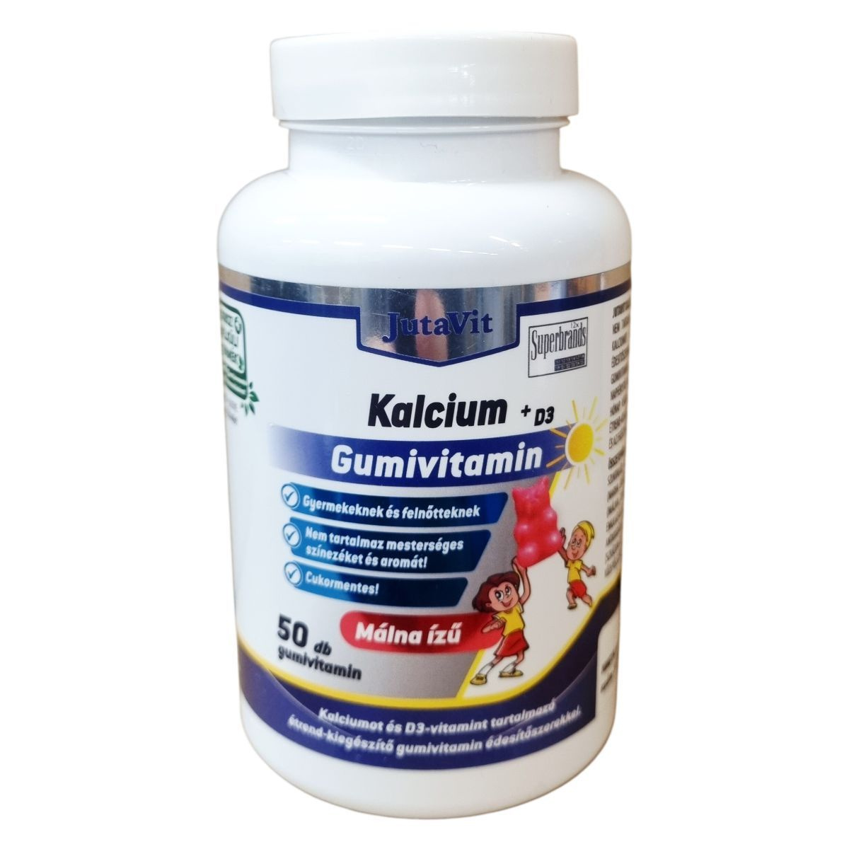 JutaVit Kalcium + D3 gumivitamin 50x Cukormentes. Gyermekeknek és felnőtteknek. Nem tartalmaz mesterséges színezéket és aromát! Málna ízű. Kalciumot és D3-vitamint tartalmazó étrend-kiegészítő gumivitamin édesítőszerekkel.