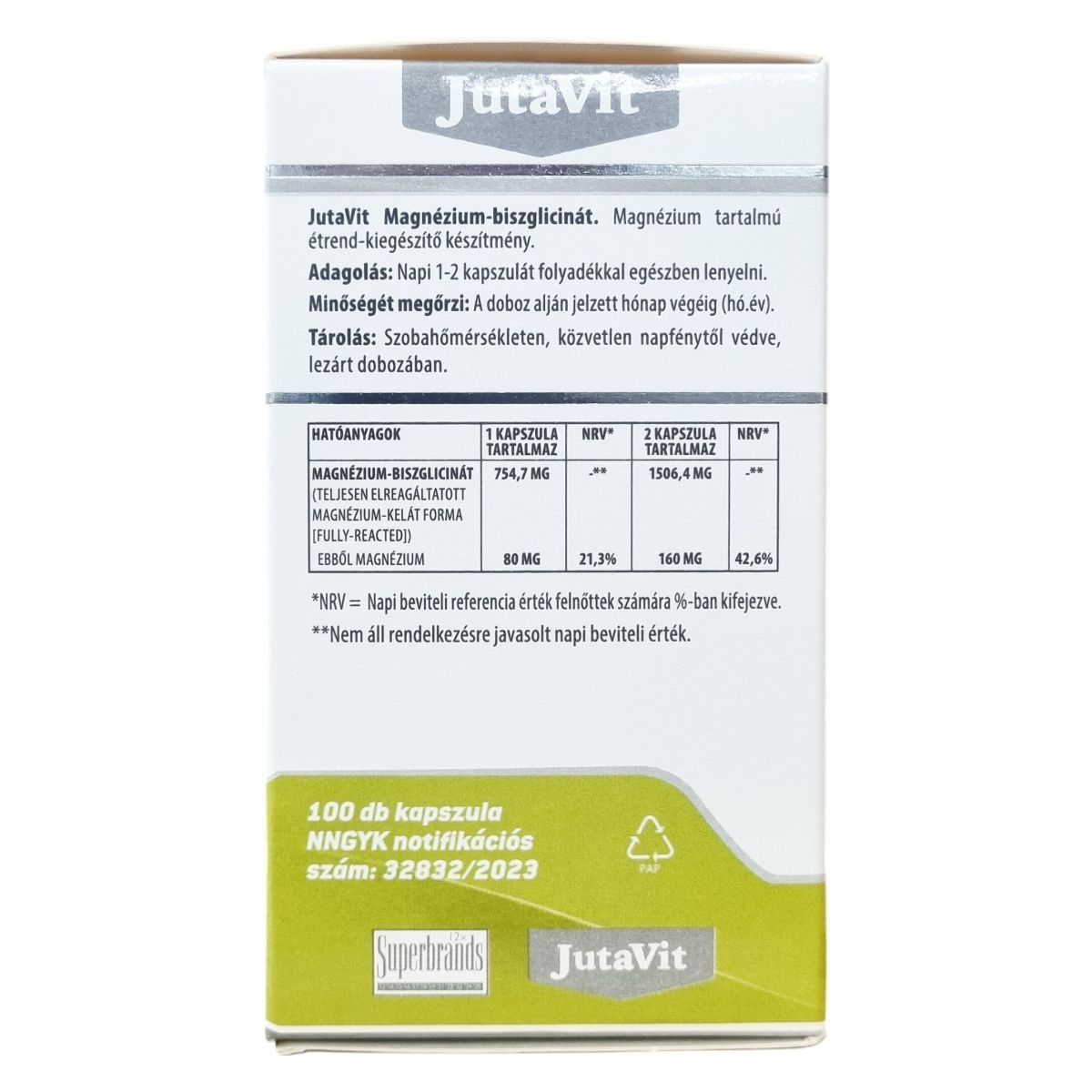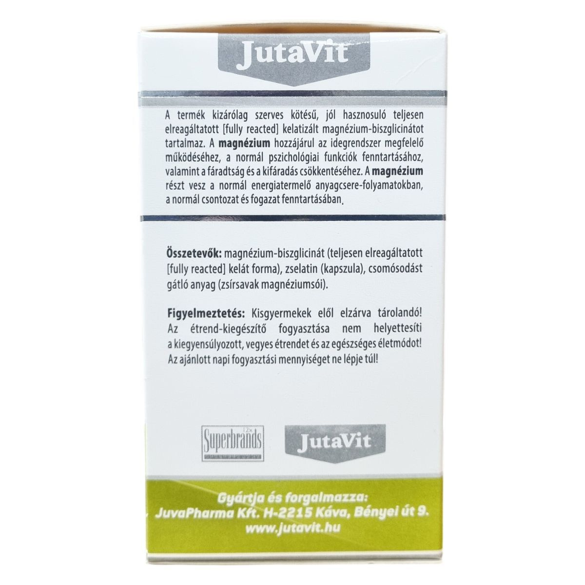 A JutaVit Magnézium-biszglicinát egy magnézium tartalmú étrend-kiegészítő készítmény, amely kizárólag szerves kötésű, teljesen elreagált kelát formájú magnézium-biszglicinátot tartalmaz. A termék színezékmentes, ami hozzájárulhat az idegrendszer megfelelő működéséhez és a normál pszichológiai funkciók fenntartásához. Emellett támogathatja a fáradtság és kifáradás csökkentését, részt vehet a normál energiatermelő anyagcsere-folyamatokban, valamint hozzájárulhat a normál csontozat és fogazat fenntartásához. A kapszulák zselatinból készülnek, és csomósodást gátló anyagok is jelen vannak a termékben. A készítmény megbízható minőségét a Superbrands tanúsítja.