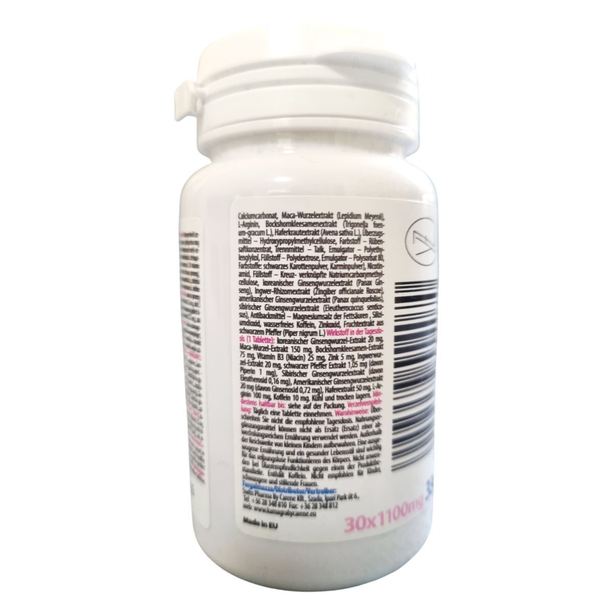 Mikrokristályos cellulóz, kalcium-karbonát, maca-gyökér-kivonat (Lepidium meyenii), L-arginin, görögszéna-kivonat (Trigonella foenum-graecum L.), zabkivonat (Avena sativa L.), bevonóanyag: glicerin, hipromellóz, talkum, emulgeálószer: poliszorbát 80, színezékek: fekete sárgarépa-por, karmin, B3-vitamin (nikotinamid), cink, inulin, koreai ginzeng-kivonat (Panax ginseng), amerikai ginzeng-kivonat (Panax quinquefolius), tajgagyökér-kivonat (Eleutherococcus senticosus), fekete bors-kivonat (Piper nigrum L.), koffein, antioxidáns: magnézium-sztearát, szilícium-dioxid.