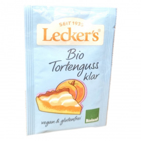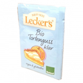 A Lecker’s Bio Tortenguss klar természetes növényi alapú, átlátszó tortabevonó, amely ideális gyümölcstortákhoz és süteményekhez. Egyszerűen elkészíthető, szép fényt és tartást ad a desszerteknek, miközben a természetes agar-agar alapú receptúra miatt állati eredetű anyagot nem tartalmaz. A termék bio, vegán és gluténmentes, így az egészségtudatos, illetve speciális étrendet követő fogyasztók számára is kiváló választás.