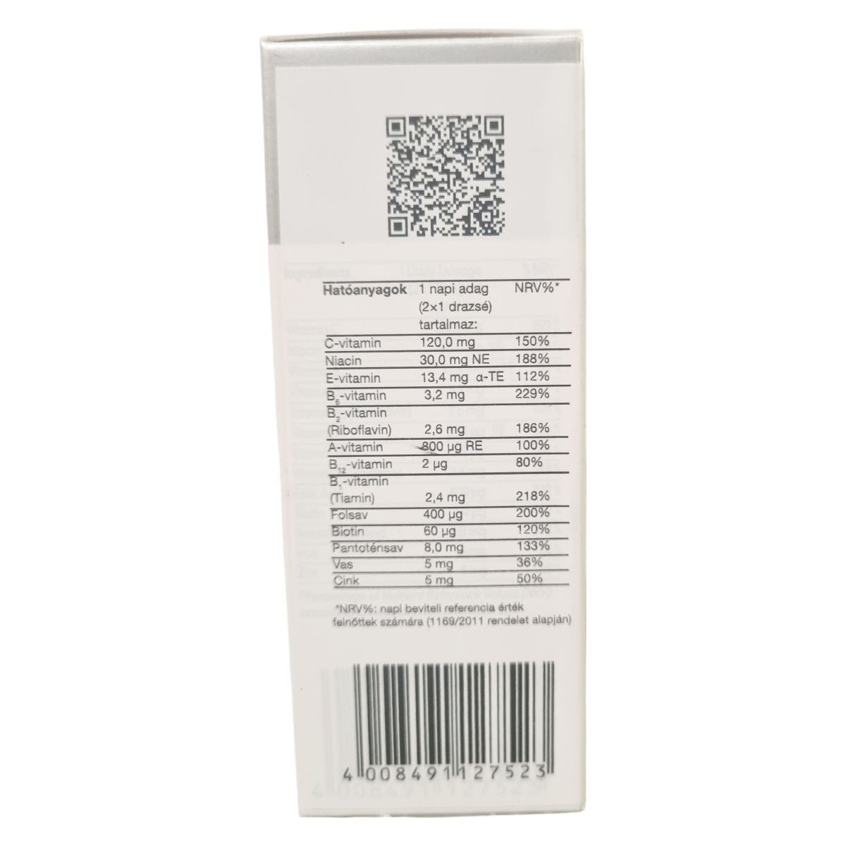 tömegnövelő szer: laktóz, szacharóz, csomósodást gátló anyag: talkum, L-aszkorbinsav (C-vitamin), tömegnövelő szer: mikrokristályos cellulóz, színezék: kalcium-karbonát, nikotinamid (niacin), tömegnövelő szer: gumiarábikum, DL-alfa-tokoferil-acetát (E-vitamin), módosított keményítő, vas-fumarát, olaj, növényi (pálmaolaj), kalcium-D-pantotenát (pantoténsav), tömegnövelő szer: mannit, cink-oxid, piridoxin-hidrochlorid (B6-vitamin), csomósodást gátló anyag: zsírsavak magnéziumsói, glükóz szirup, tiaminn-mononitrát (B1-vitamin), riboflavin (B2-vitamin), csomósodásgátló anyag: szilícium-dioxid, zselatin, retinil-acetát (A-vitamin), pterol-monoglutaminsav (folsav), színezékek: Indigotin, vas-oxidok vörös, D-biotin, bevonóanyag: shellac, karnauba viasz, méhviasz, cianokobalamin (B12-vitamin)