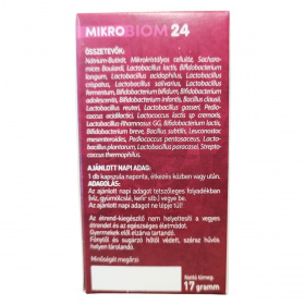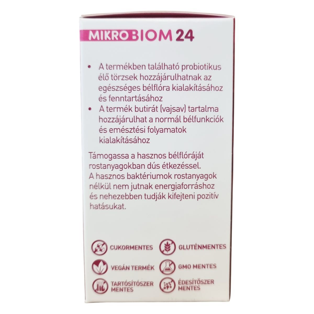 A Mikrobiom 24 egy olyan étrend-kiegészítő, amely élőflórát és butirátot (vajsav) tartalmaz vega kapszula formájában. A termék 30 kapszulát foglal magába, melyek gyomorsav ellenálló bevonattal rendelkeznek, így a hasznos baktériumok túlélési esélyeit növelik. A készítmény probiotikus baktériumtörzseket tartalmaz, melyek hozzájárulhatnak az egészséges bélflóra kialakításához és fenntartásához, valamint elősegíthetik a normál bélfunkciók és emésztési folyamatok kialakulását. A butirát (vajsav) fontos energiaforrást jelenthet a béltraktus számára, továbbá támogatja a bélsejtek működését. A termék cukor- és gluténmentes, GMO-mentes, valamint nem tartalmaz tartósítószert vagy édesítőszert. Használata során javasolt rostanyagokban gazdag étrendet követni, mivel a rostok energianyerési forrást biztosíthatnak a hasznos baktériumok számára, elősegítve hatékony működésüket. A kapszulát napi egyszer, étkezés közben vagy után kell bevenni, folyadékkal.