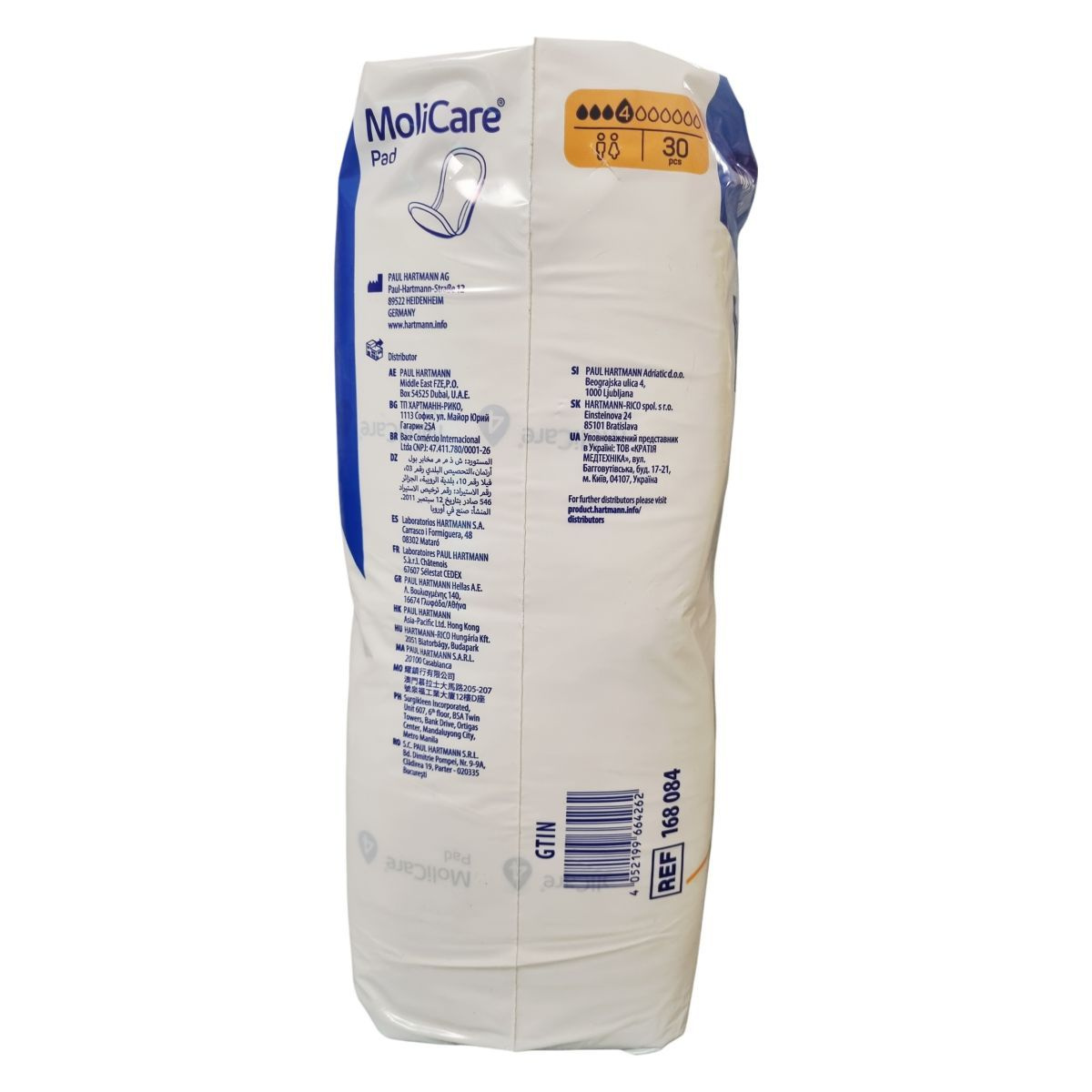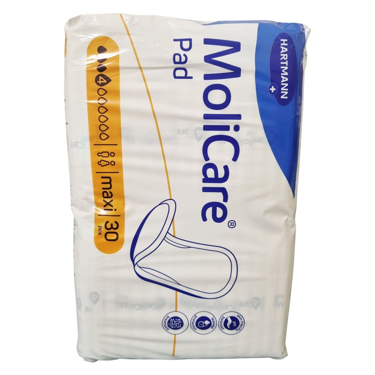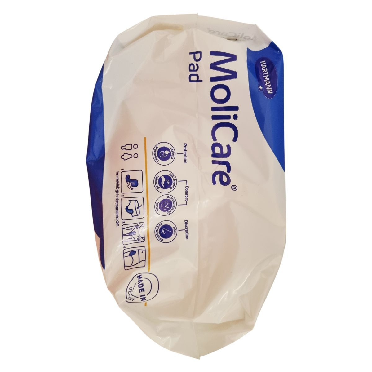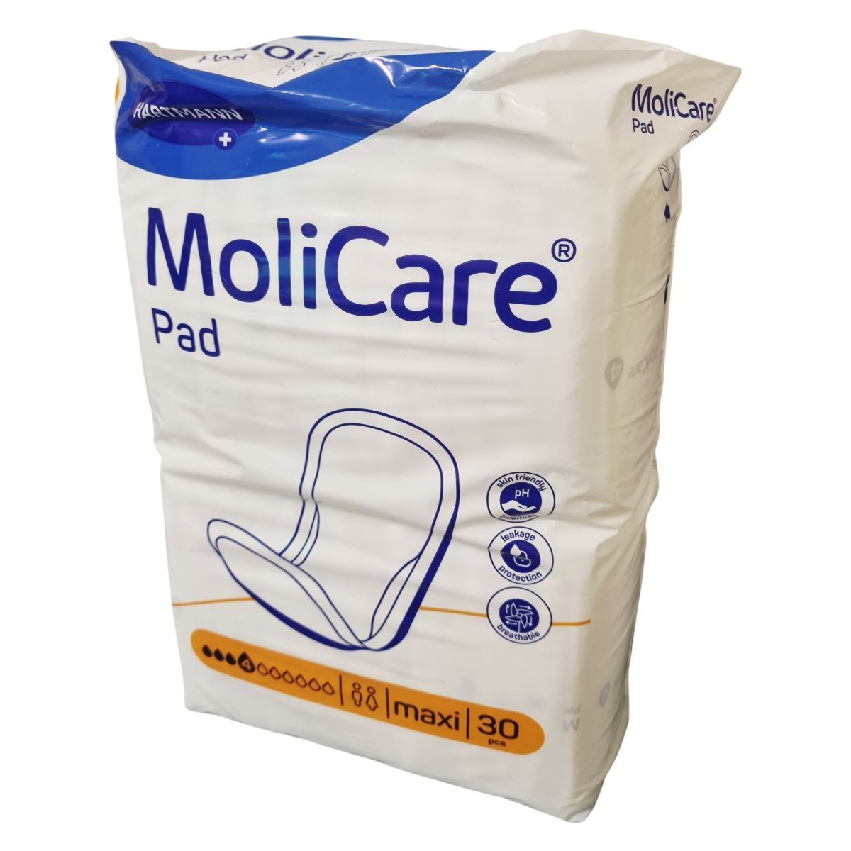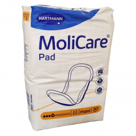 A MoliCare Pad egy német gyártású, könnyű inkontinenciára fejlesztett higiéniai betét. A csomagoláson szereplő jelölések szerint pH-kiegyensúlyozott, bőrbarát kivitelű, légáteresztő anyagból készül, amely kényelmet és diszkréciót biztosíthat viselés közben. Szivárgás elleni védelemmel és szagszabályozó tulajdonságokkal rendelkezik. A termék női és férfi felhasználók számára egyaránt alkalmas. A csomag 30 darab betétet tartalmaz, 4 csepp nedvszívó hatással.Enyhe vizelettartási nehézség esetén használható nedvszívó betét. Németországban készült.
