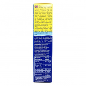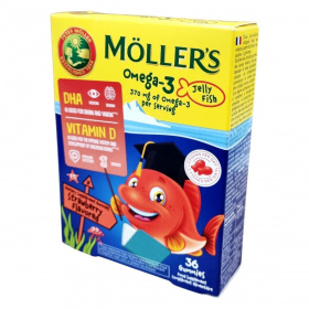 A Möller’s Omega-3 Jelly Fish gumivitamin Norvégiában készült étrend-kiegészítő, amely halolajból származó esszenciális omega-3 zsírsavakat (DHA és EPA) tartalmaz. A DHA hozzájárulhat az agy és a látás normál működéséhez, míg a D-vitamin szerepet játszhat a gyermekek csontjainak normál növekedésében és fejlődésében, valamint az immunrendszer megfelelő működésében. A gumivitamin természetes eper ízesítésű, halacska formájú és cukormentes, így a gyerekek számára élvezetes és biztonságos formában biztosítja a szükséges tápanyagokat. A készítmény xilit és szorbit édesítőszerrel készül, mesterséges színezéket nem tartalmaz, a piros színt természetes kármin adja. Az antioxidáns aszkorbinsav segítheti az összetevők stabilitását. A termék napi két gumivitamin adagban 560 mg halolaj-koncentrátumot, 374 mg omega-3 zsírsavat (ebből 280 mg DHA és 56 mg EPA), valamint 10 µg D-vitamint tartalmaz. A doboz 36 darab gumivitamint tartalmaz, ami 18 napos adagolásra elegendő. Ideális választás gyermekeknek hároméves kortól, a fejlődő idegrendszer, látás és immunrendszer támogatásához, finom eper ízben.