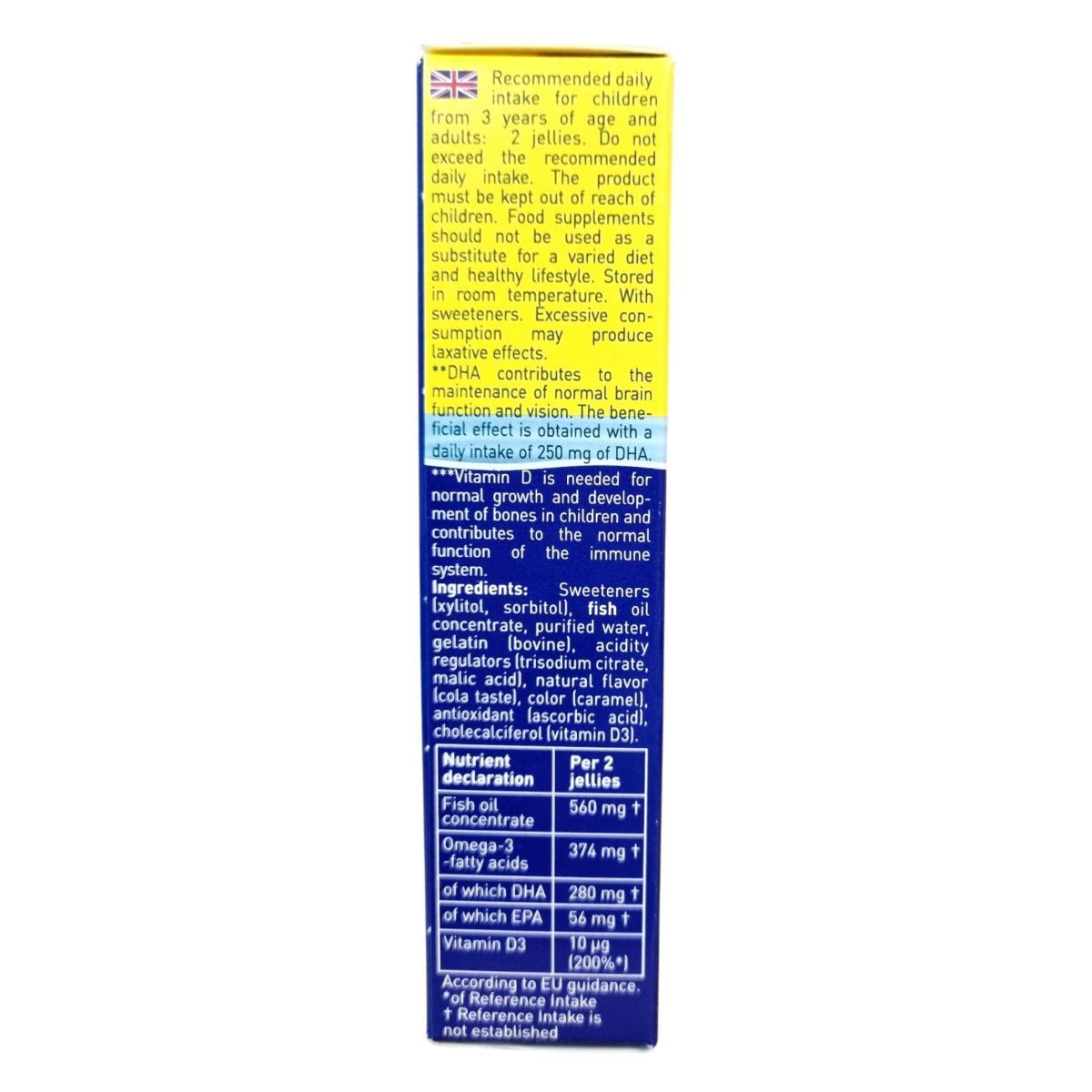 Möller’s Omega-3 halacska gumivitamin étrend-kiegészítő gyerekeknek D-vitaminnal, kóla ízesítéssel. A termék DHA-t tartalmaz, amely hozzájárul az agy és a látás normál működéséhez. A kedvező hatás eléréséhez napi min. 250 mg DHA szükséges. A D-vitamin hozzájárul az immunrendszer normál működéséhez, valamint a gyermekek csontozatának normál növekedéséhez és fejlődéséhez.