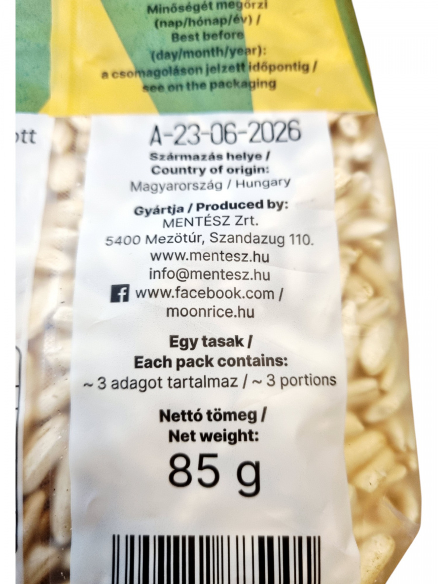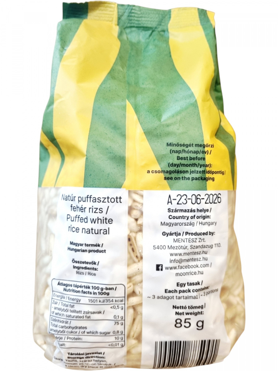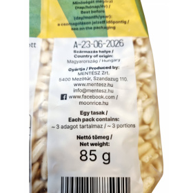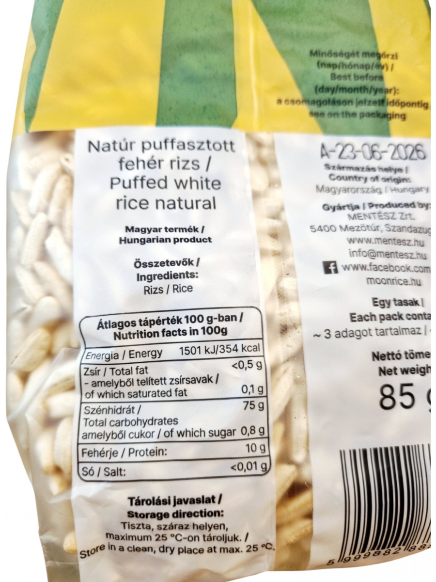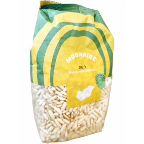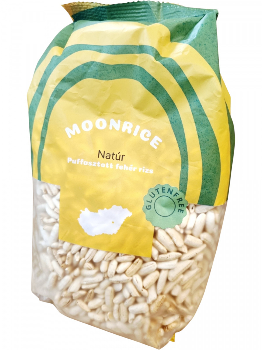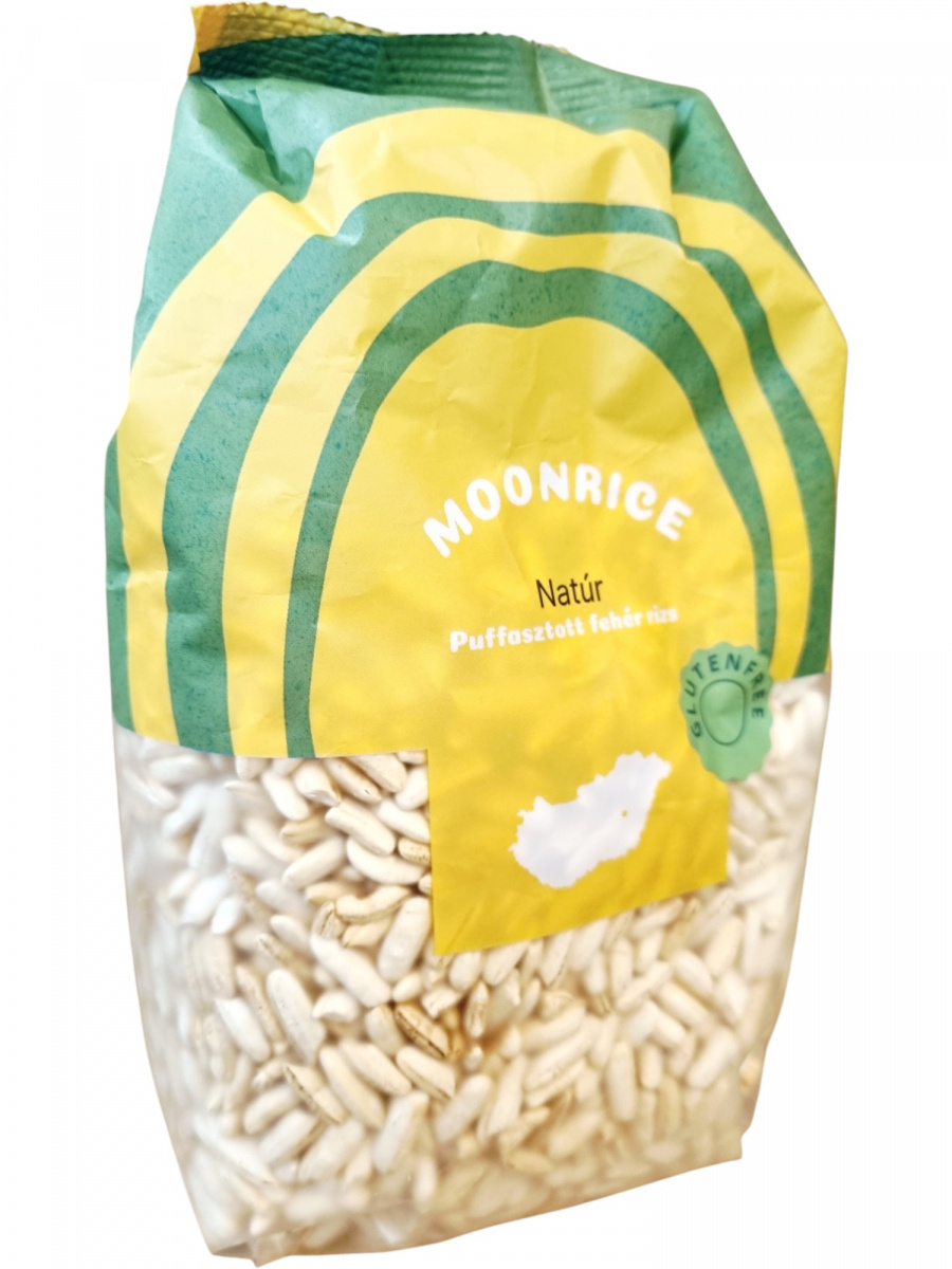 A Moonrice natúr puffasztott fehér rizs magyar termék, amely egyszerű, természetes alapanyagból készül. A csomagolás 85 g-ot tartalmaz, amely kb. 3 adag. Könnyű, ropogós állagának köszönhetően önmagában fogyasztható nassolnivalóként, vagy különféle ételek, joghurtok, saláták kiegészítőjeként. A gluténmentesség biztosítja, hogy érzékenyek számára is alkalmas választás. A termék energia- és tápanyagtartalma alapján jól illeszthető kiegyensúlyozott étrendbe.