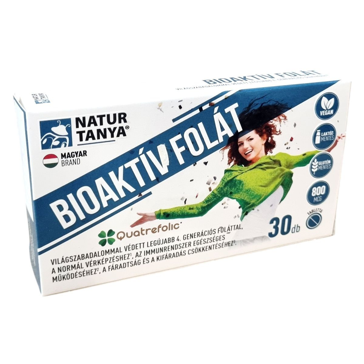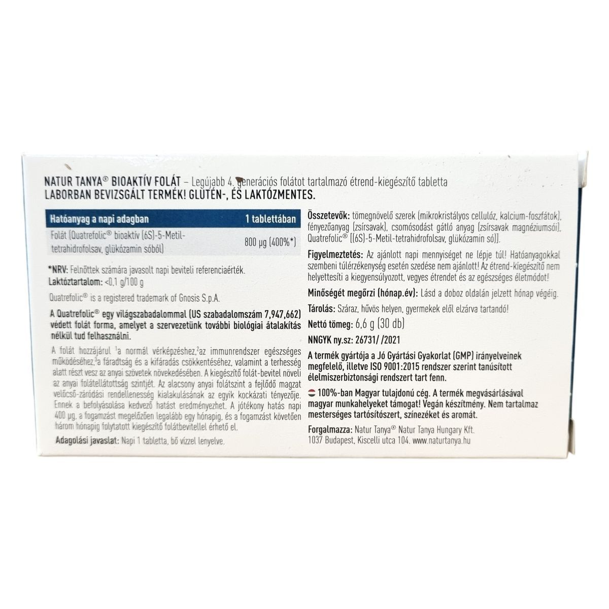 A Natur Tanya® Bioaktív Folát étrend-kiegészítő a Quatrefolic® világelső, világszabadalommal védett 4. generációs folát formáját tartalmazza, amelyet a szervezet további biológiai átalakítás nélkül képes hasznosítani. A folát hozzájárulhat a normál vérképzéshez, az immunrendszer egészséges működéséhez, valamint a fáradtság és kifáradás csökkentéséhez. A termék a terhesség alatt is támogathatja az anyai szövetek növekedését, és hozzájárulhat az anyai folátellátottság növeléséhez, amely fontos szerepet játszhat a magzat egészséges fejlődésében, különösen a velőcső-záródási rendellenességek kockázatának csökkentésében. A jótékony hatás eléréséhez napi 400 µg folát bevitele ajánlott, amelyet a fogamzás előtt legalább egy hónappal, és a fogamzást követően három hónapig ajánlott folytatni. A termék GMO-mentes, nem tartalmaz mesterséges tartósítószert, színezéket vagy aromát, és laboratóriumban bevizsgált, glutén- és laktózmentes kivitelben készül. A termék 100%-ban magyar tulajdonú cég gyártásában készül, amely a Jó Gyártási Gyakorlat és ISO 9001:2015 szabványok szerint tanúsított élelmiszerbiztonsági rendszert alkalmaz.