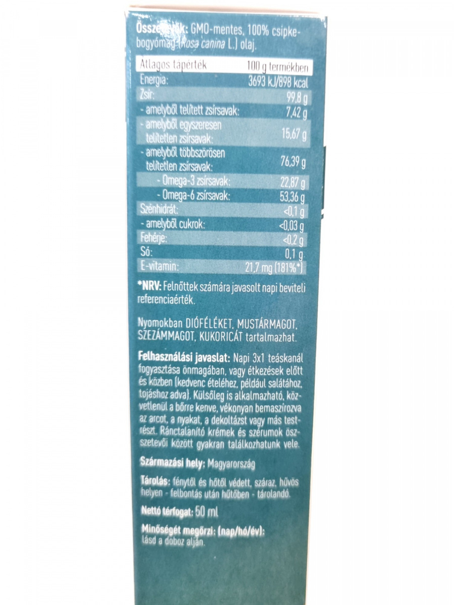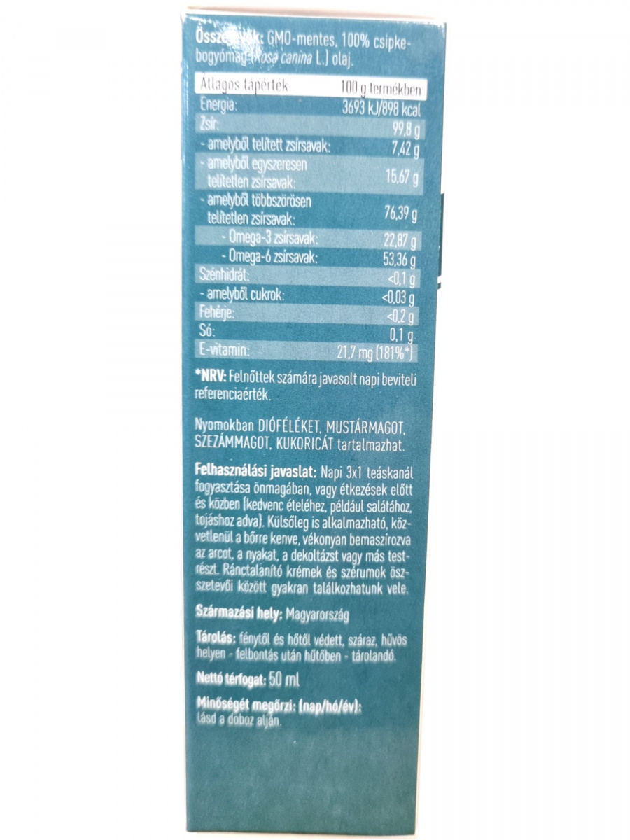 Természetes E-vitaminban gazdag, antioxidáns hatású, hidegen sajtolt csipkebogyómag olaj, amely belsőleg és külsőleg egyaránt alkalmazható.