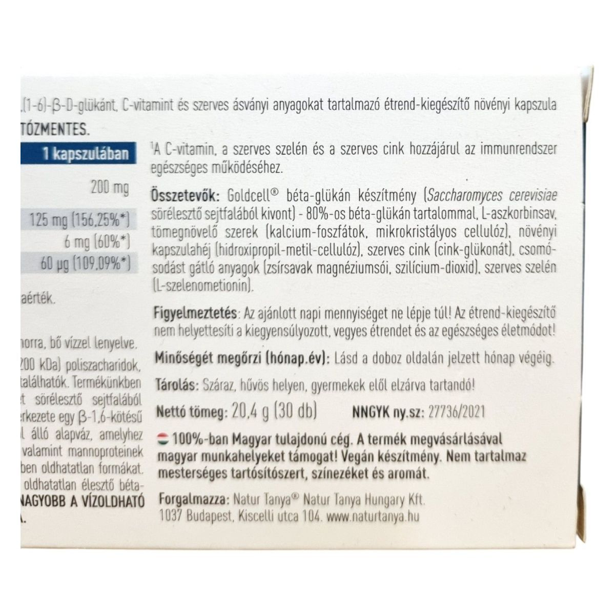A Natur Tanya Fermentált Béta-glükán kapszula védjegyzett Goldcell® béta-glükánt tartalmaz, amelyet sörélesztő sejtfalából nyernek. A termékben található β-1,3 és β-1,6 kötésű glükánláncok komplex poliszacharidok, melyek oldhatatlan formában vannak jelen. A C-vitamin, a szerves cink és a szerves szelén együttesen támogathatják az immunrendszer normál működését. A termék 100 %-ban magyar tulajdonú vállalkozás fejlesztése, vegán összetételű, nem tartalmaz mesterséges adalékanyagot, színezéket vagy aromát. Biológiai aktivitása magasabb, mint a vízoldható béta-glükán formáké (pl. árpa, zab) – összetétele különösen alkalmas a mindennapi egészségtudatos étrend kiegészítésére.