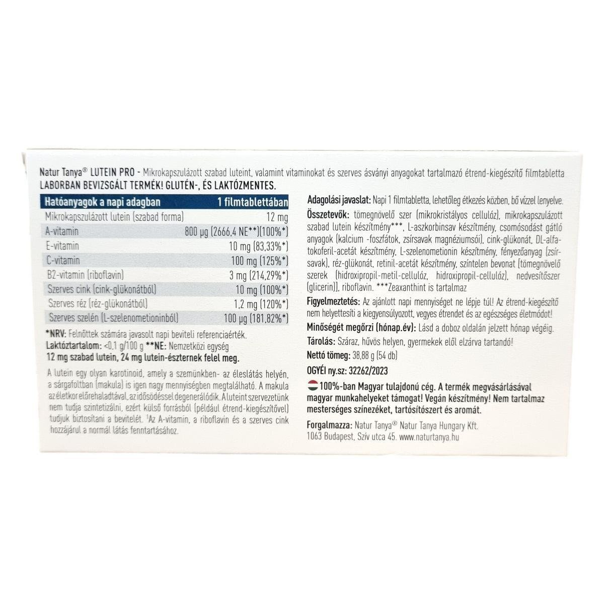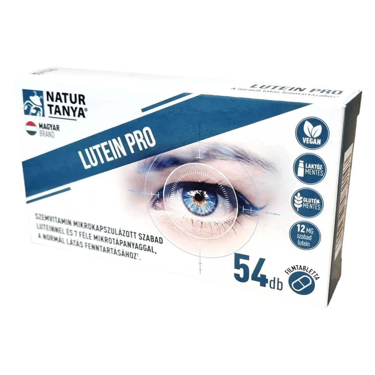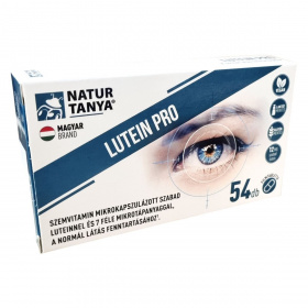 A Natur Tanya® LUTEIN PRO mikrokapszulázott szabad luteint, valamint vitaminokat és szerves ásványi anyagokat tartalmazó étrend-kiegészítő filmtabletta. A termék laboratóriumban bevizsgált, glutén- és laktózmentes készítmény. Egy filmtabletta napi adagja 12 mg mikrokapszulázott szabad luteint tartalmaz, amely 24 mg lutein-észternek felel meg. A lutein egy karotinoid, amely nagy mennyiségben található meg a szem sárgafoltjában (makulájában), amely az életkor előrehaladtával degenerálódhat. A szervezet nem képes szintetizálni, ezért külső forrásból, például étrend-kiegészítővel juttatható be. Az A-vitamin, a riboflavin és a szerves cink hozzájárulhatnak a normál látás fenntartásához. A készítmény nem tartalmaz mesterséges színezéket, tartósítószert és aromát, és 100%-ban magyar tulajdonú cég terméke, amely vásárlásával magyar munkahelyeket támogat. A nettó tömege 38,88 g, 54 db filmtablettát tartalmaz.