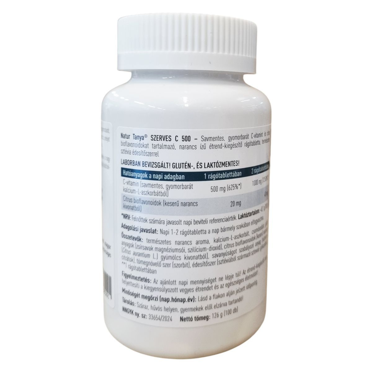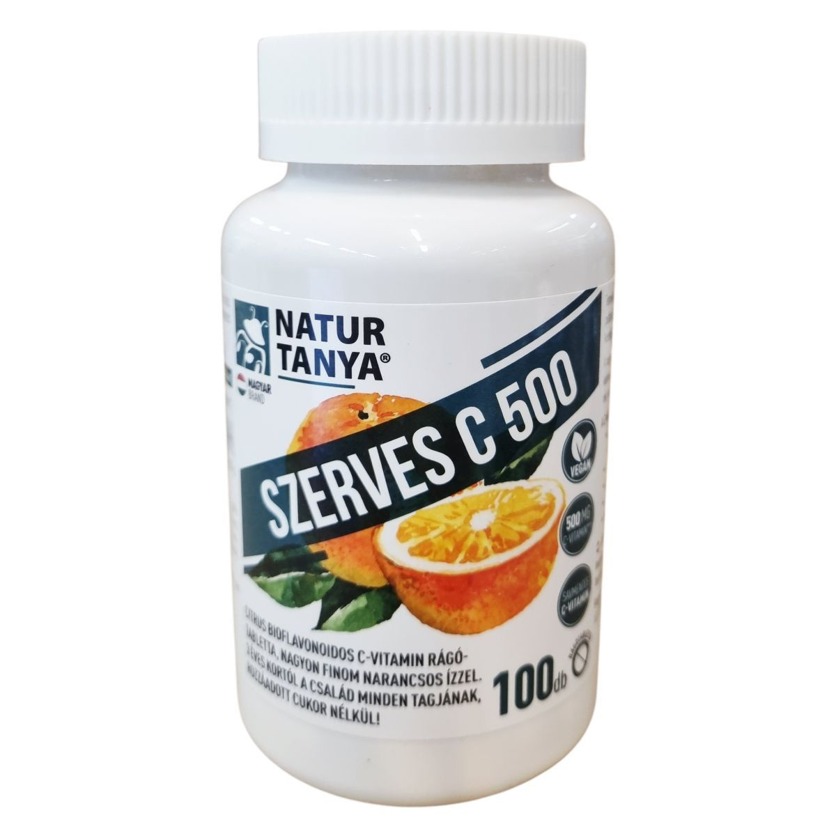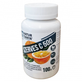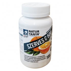 A Natur Tanya® SZERVES C 500 egy természetes alapanyagokból készült étrend-kiegészítő rágótabletta, amely kalcium-L-aszkorbát formájában biztosítja a C-vitamint, így gyomorbarát és savmentes. A keserű narancsból kivont standardizált bioflavonoid tartalom segítheti a vitamin biológiai hasznosulását. A termék élvezetes, narancsos ízű, természetes sztévia édesítőszerrel készült, hozzáadott cukor nélkül, így kicsiknek és nagyoknak is ajánlott, különösen azoknak, akik érzékeny gyomorral vagy nyelési nehézséggel küzdenek. Nem tartalmaz mesterséges tartósítószert, színezéket vagy aromát. A termék 100%-ban magyar tulajdonú cég gyártása, ezzel támogatja a helyi munkahelyeket. Laborban bevizsgált, glutén- és laktózmentes készítmény.