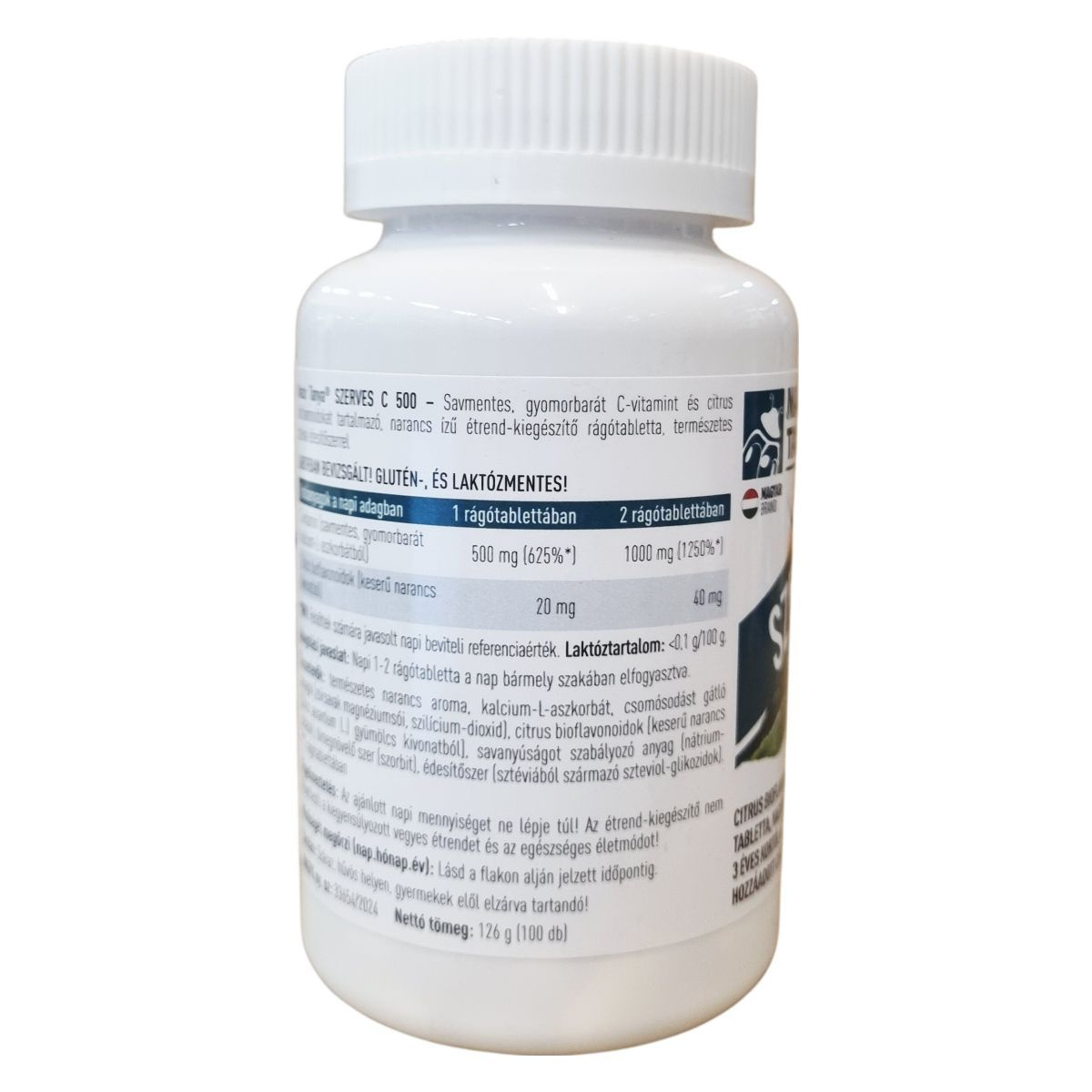 C-vitamin (savmentes, gyomorbarát kalcium-L-aszkorbátból): 500 mg (1 rágótablettában, 625% NRV),