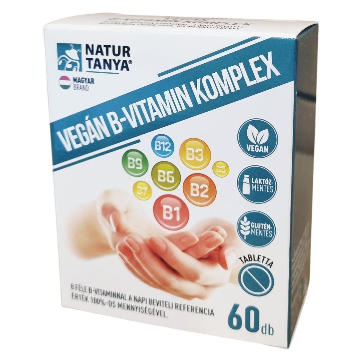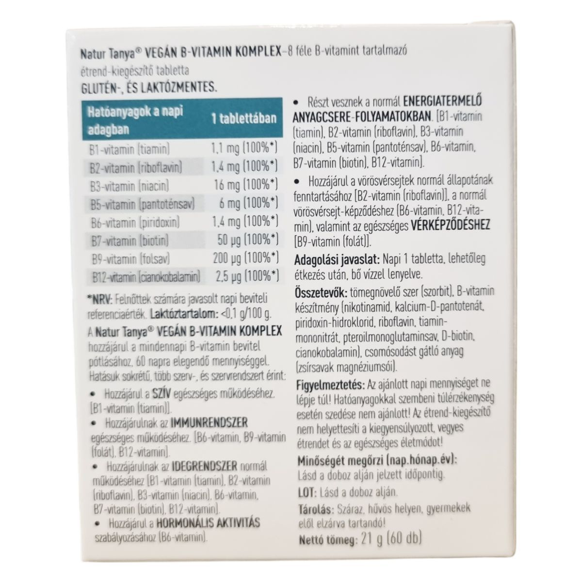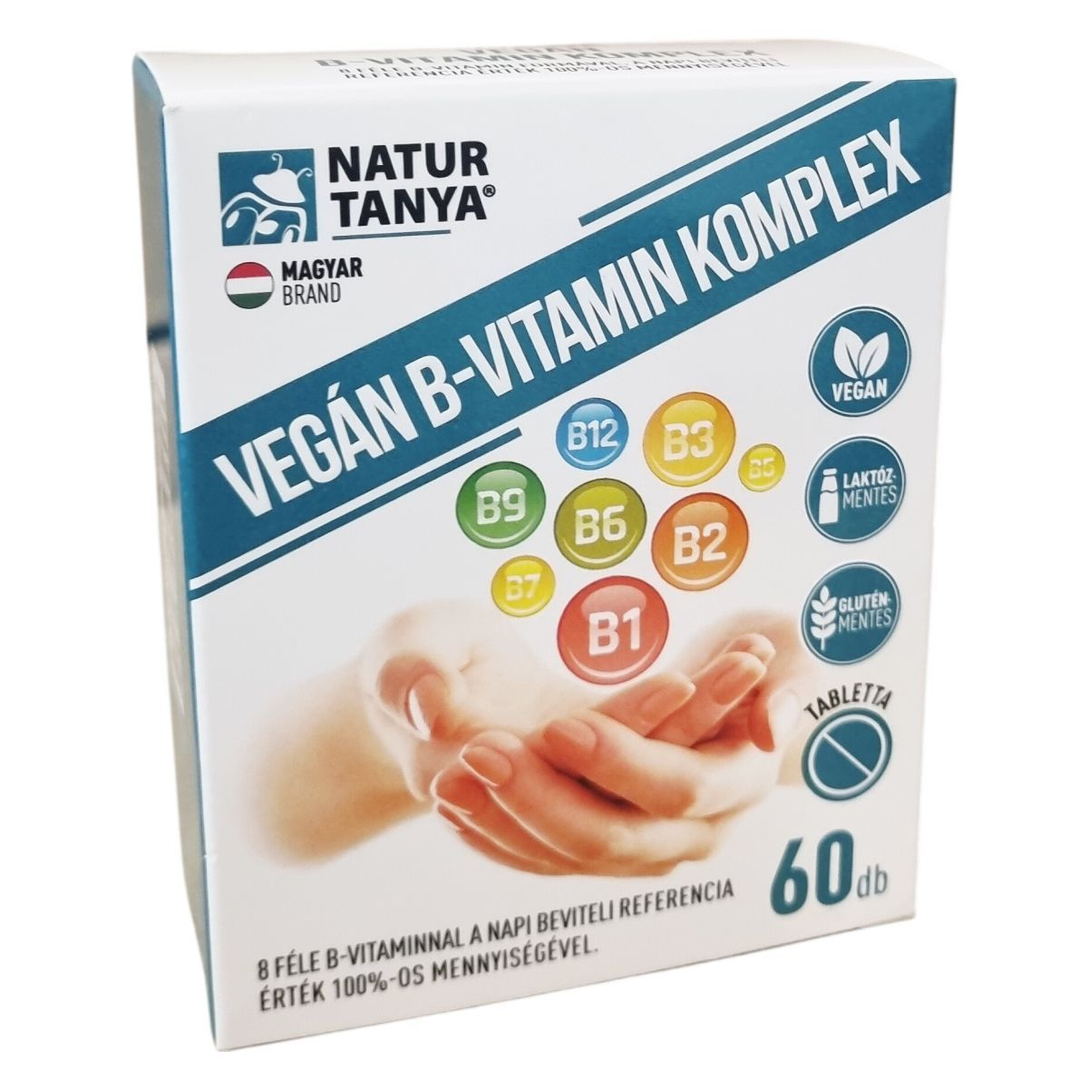 A Natur Tanya® VEGÁN B-VITAMIN KOMPLEX 8 féle B-vitamint tartalmazó étrend-kiegészítő tabletta, amely glutén- és laktózmentes. A termék 100%-ban magyar tulajdonú céghez kötődik, és megvásárlásával magyar munkahelyeket támogathat. A készítmény vegán, nem tartalmaz mesterséges tartósítószert, színezéket és aromát. A 60 napra elegendő mennyiség segítheti a mindennapi B-vitamin bevitel pótlását. A B-vitaminok hatásuk sokrétűek, több szerv- és szervrendszert érinthetnek, többek között hozzájárulhatnak a szív egészséges működéséhez, az immunrendszer támogatásához, az idegrendszer normál működéséhez, a hormonális aktivitás szabályozásához, valamint részt vehetnek a normál energiatermelő anyagcsere-folyamatokban. Emellett segíthetik a vörösvérsejtek normál állapotának fenntartását, normál vörösvérsejt-képződéshez járulhatnak hozzá, valamint támogathatják az egészséges vérképződést.