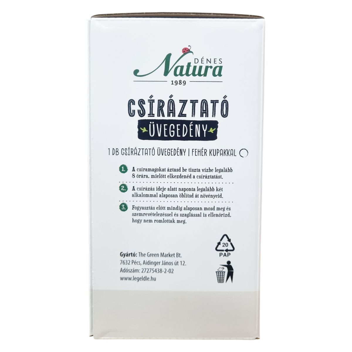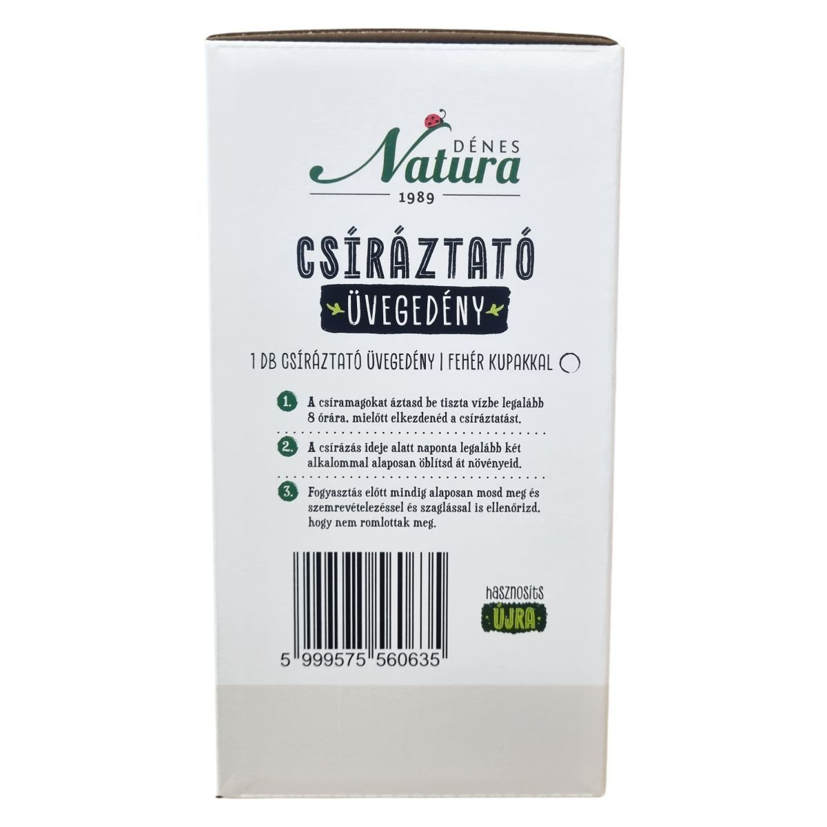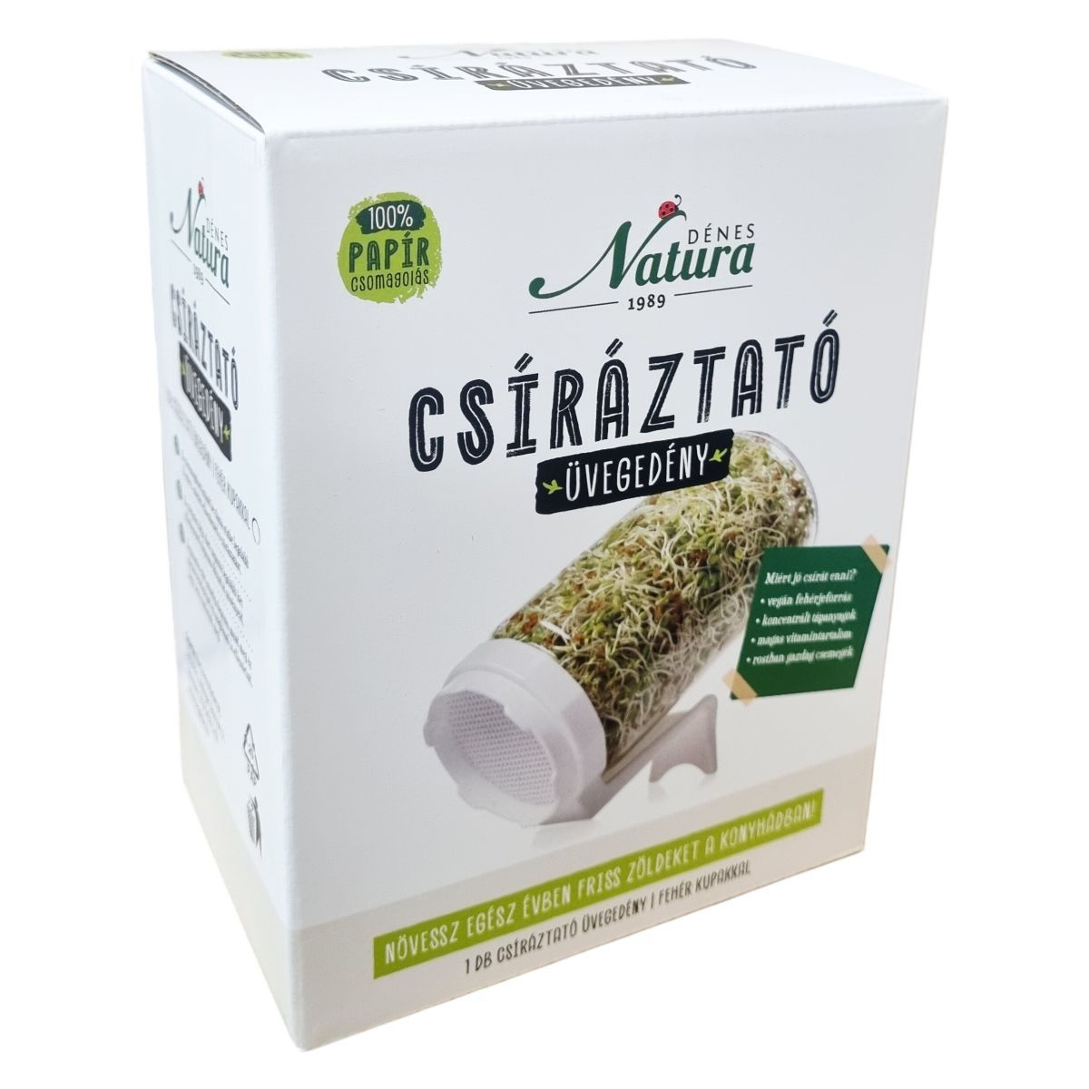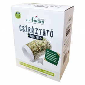 A Dénes Natura 1989 csíráztató üvegedény fehér kupakkal ideális eszköz friss zöldek termesztéséhez egész évben a konyhában. A csírák vegán fehérjeforrást és rostban gazdag, magas vitamintartalmú finomságokat kínálnak, melyek táplálóak és változatosak. A csíráztatás során fontos a magok beáztatása és rendszeres, naponta kétszeri átöblítés. Friss vegyes csírasaláta készítéséhez a lencsecsíra ajánlott alapnak, melyhez sokféle csíra és apróra vágott zöldség adható, és ízlés szerint olívaolajjal, citromlével, sóval, agávé sziruppal vagy fűszerezett joghurttal ízesíthető.