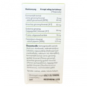 Tömegnövelő szerek (kalcium-karbonát, mikrokristályos cellulóz), kapszulahéj (hidroxipropil-metilcellulóz, nátrium-réz-klorofillin), fermentált koreai vörös ginzeng gyökér kivonat (Panax ginseng), amerikai ginzeng gyökér kivonat (Panax quinquefolius), tajgagyökér gyökér kivonat (Eleutherococcus senticosus), csomósodást gátló anyagok (szilícium-dioxid, zsírsavak magnéziumsói), frukto-oligoszacharidok, feketebors-kivonat (Piper nigrum).