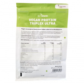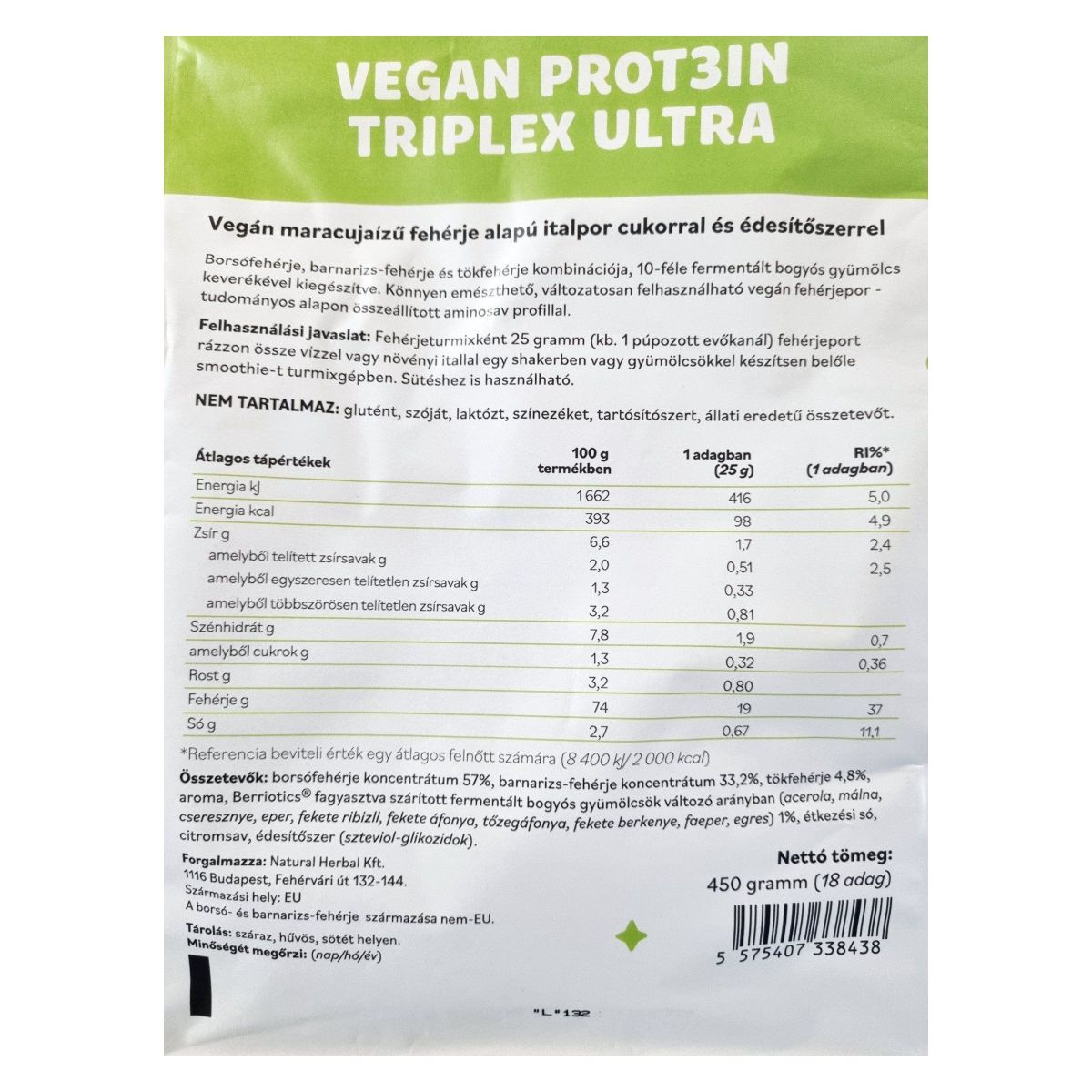 A VEGAN PROT3IN TRIPLEX ULTRA egy maracuja ízű vegán fehérje alapú italpor, amely borsó-, barnarizs- és tökfehérje kombinációját tartalmazza. A termék 10-féle fermentált bogyós gyümölcs keverékkel van kiegészítve, amely segíthet a változatos étrend támogatásában. Könnyen emészthető, és változatosan felhasználható, például turmixok vagy sütés során. A termék nem tartalmaz glutént, szóját, laktózt, színezéket, tartósítószert, és állati eredetű összetevőt sem. A borsó- és barnarizs-fehérje származása nem-EU, míg a termék származási helye az EU. A termék 450 grammos kiszerelésben kapható, amely 18 adagot tartalmaz.