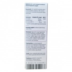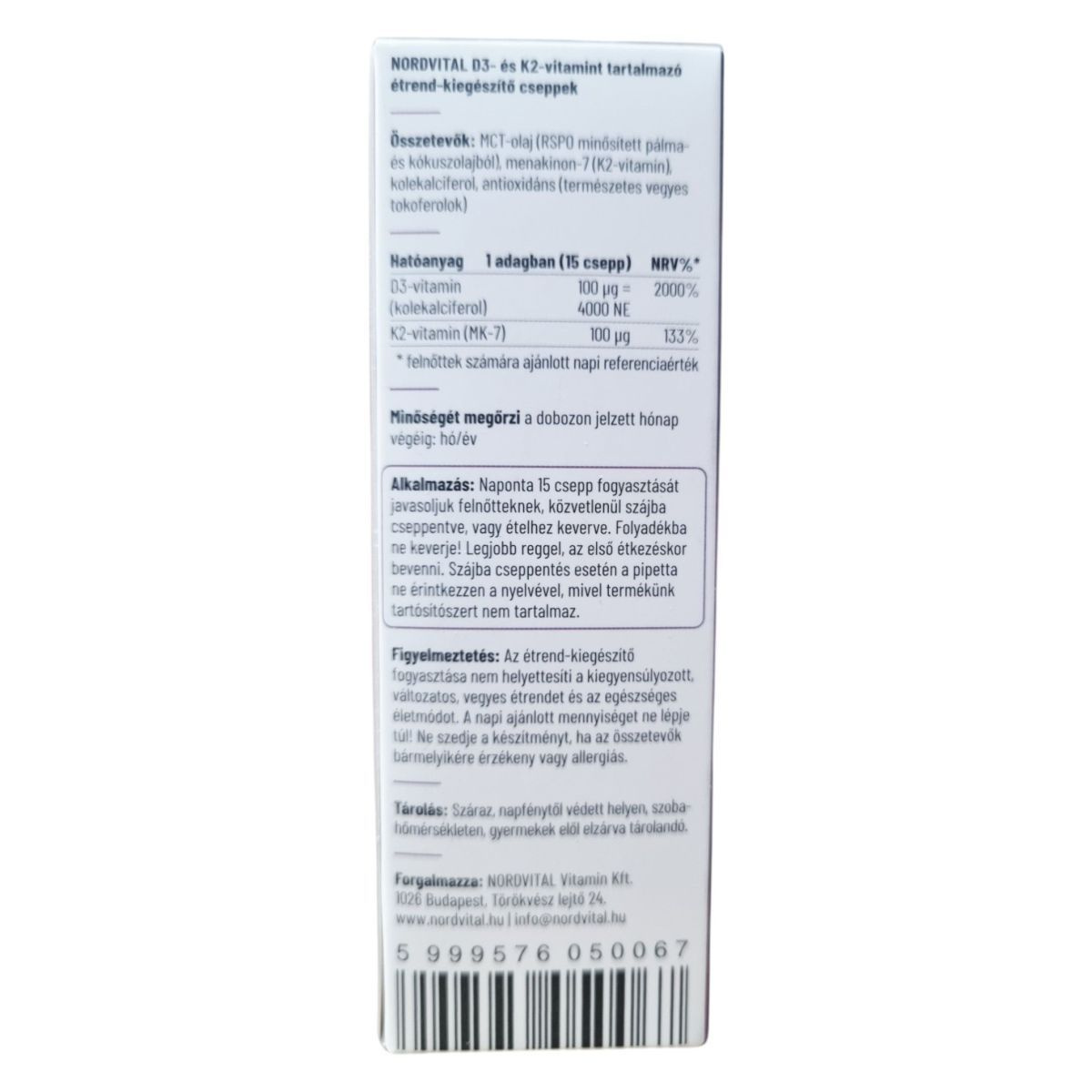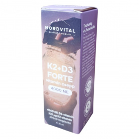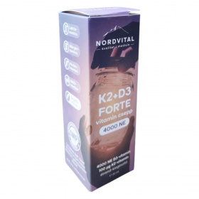 A NORDVITAL K2+D3 FORTE vitamin csepp egy speciális étrend-kiegészítő, amely D3- és K2-vitaminokat tartalmaz. A termék RSPO minősített MCT olajban oldott vitaminokat tartalmaz, ami segíthet a hatóanyagok jobb felszívódásában. A K2-vitamin natto fermentált forrásból származik, és MK-7-es aktív „transz-izomer” formában van jelen. A termék GMO-mentes, gluténmentes és laktózmentes, valamint vegetáriánus étrendbe is beilleszthető. A termék GMP minősített gyártóüzemben készült, és OGYÉI által notifikált.