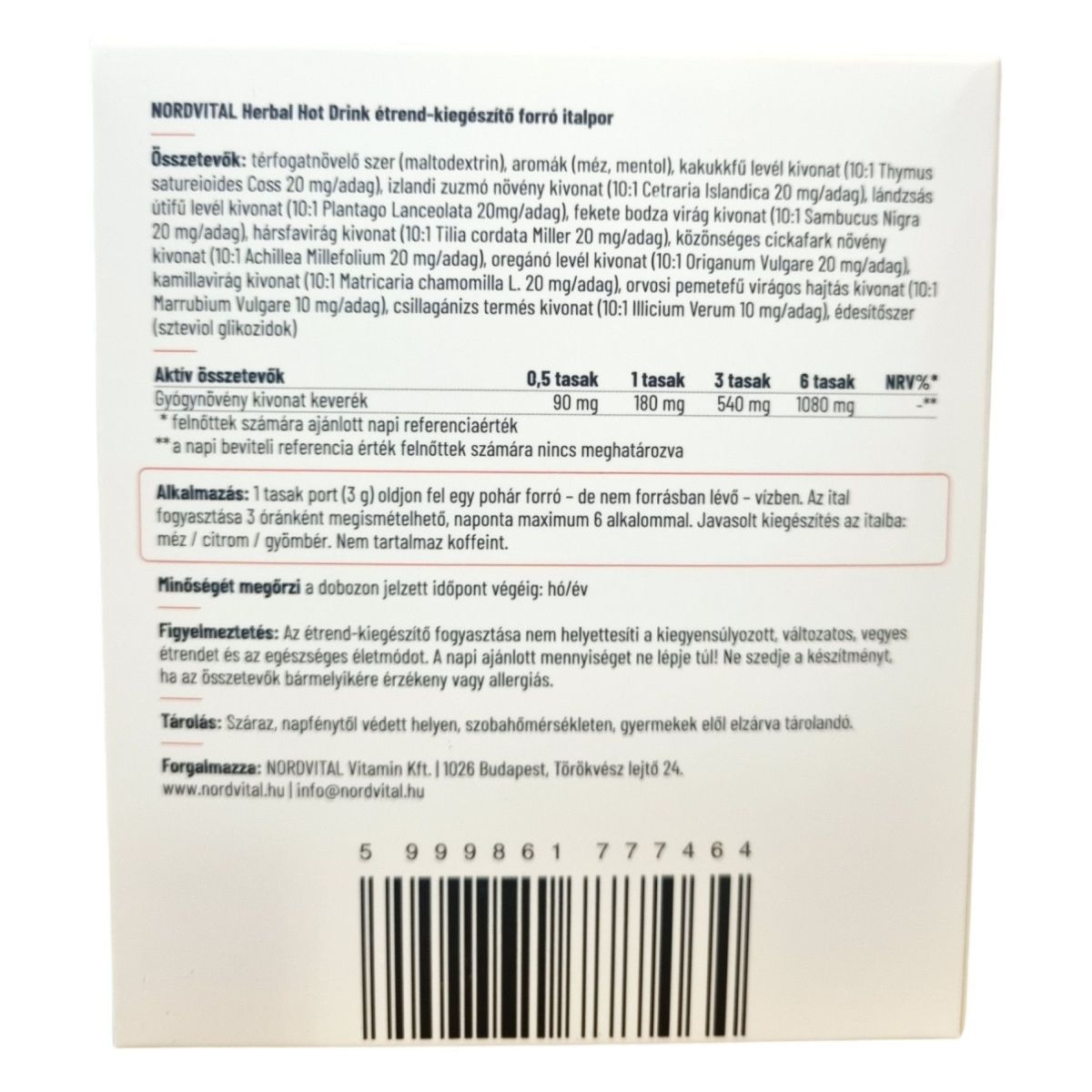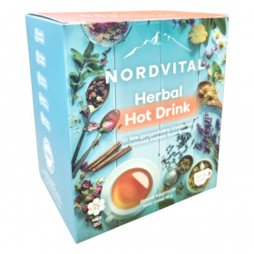 A NORDVITAL Herbal Hot Drink egy 10 féle gyógynövény kivonatot tartalmazó instant forró italpor, amely méz ízű és koffeinmentes. A termék nem tartalmaz mesterséges színezéket, aromát vagy tartósítószert, és laborban bevizsgált. A termék laktózmentes, gluténmentes és GMO-mentes, így különböző étrendi igényeknek is megfelelhet. Az italpor alkalmazása egyszerű: egy tasak port forró vízben kell feloldani, és naponta akár 6 alkalommal is fogyasztható. A termék GMP minősített gyártóüzemben készült, és a NORDVITAL Vitamin Kft. forgalmazza.