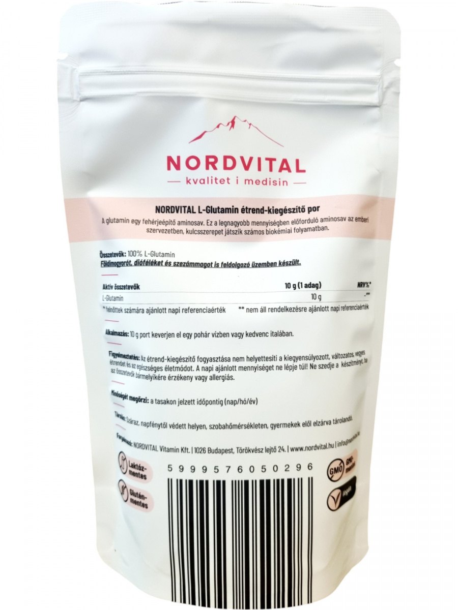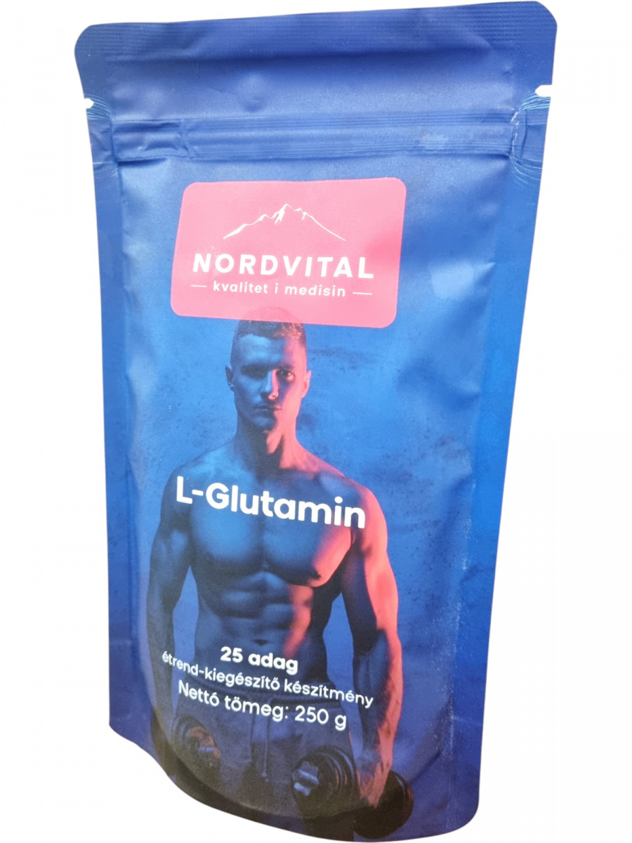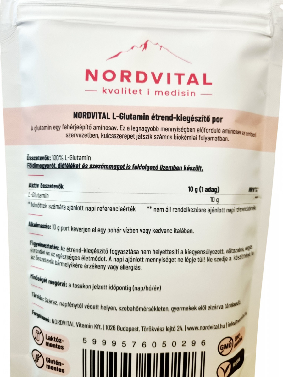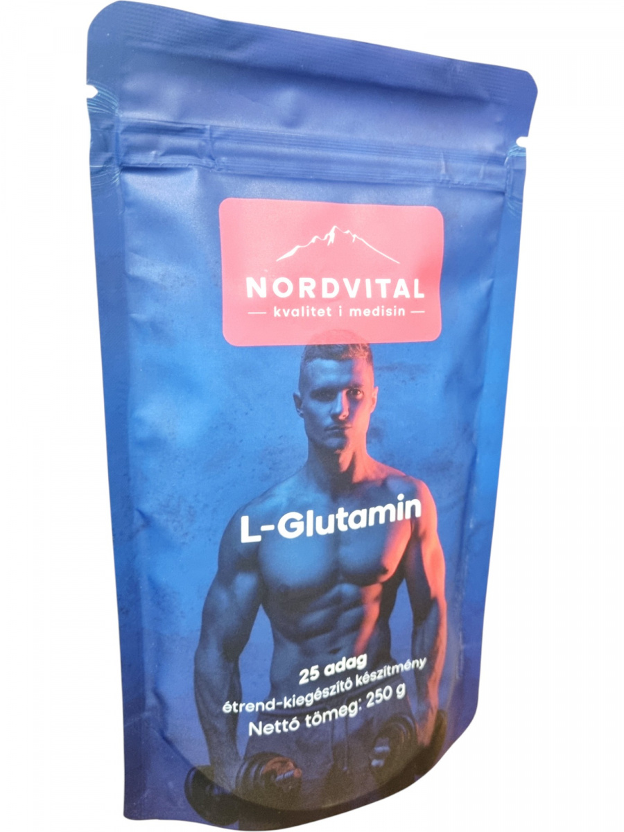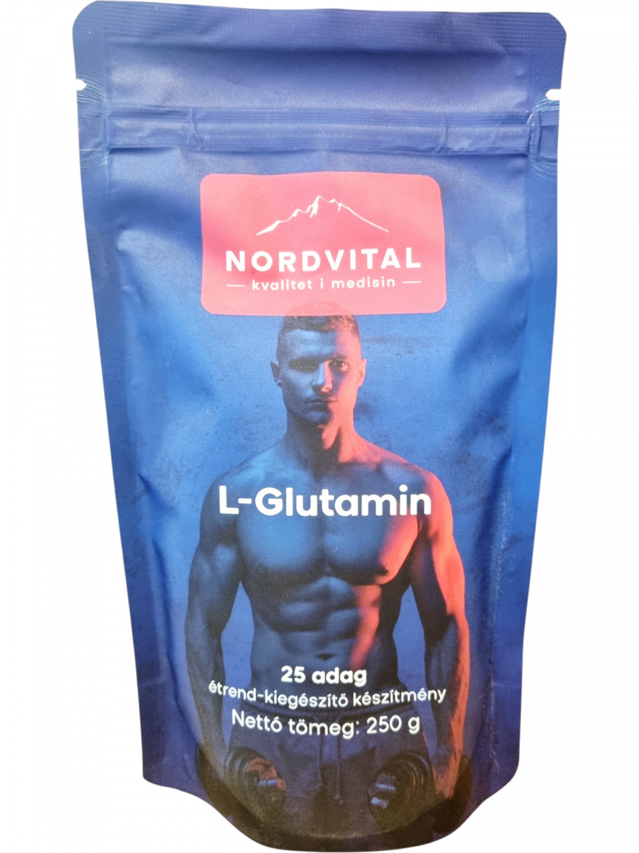 A Nordvital L-Glutamin étrend-kiegészítő por 100%-ban tiszta L-glutamint tartalmaz. A glutamin egy fehérjeépítő aminosav, amely a szervezetben nagy mennyiségben fordul elő, és kulcsszerepet játszik számos biokémiai folyamatban. A termék praktikus, por állagú kiszerelésben érkezik, így könnyen elkeverhető vízben vagy más italban. A csomag 25 adag port tartalmaz, nettó tömege 250 g. A gyártó laktóz- és gluténmentességet, valamint GMO-mentességet is garantál, így széles körben alkalmazható különféle étrendekben. A csomagolás hangsúlyozza, hogy az étrend-kiegészítő fogyasztása nem helyettesíti a változatos étrendet és az egészséges életmódot.