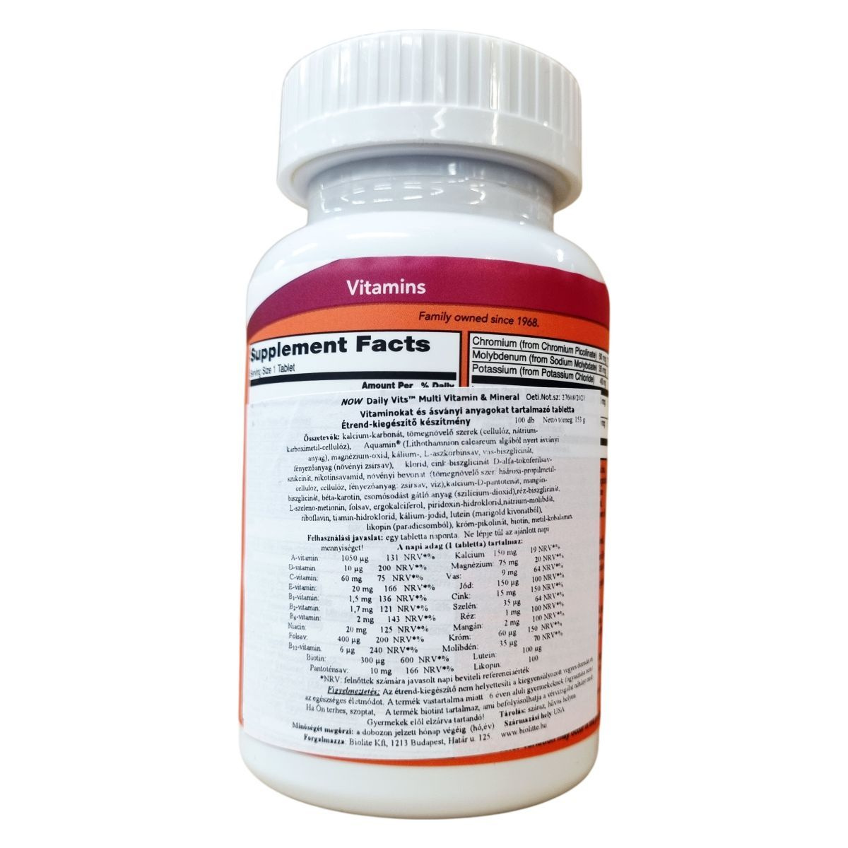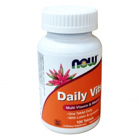 A NOW Daily Vits™ egy vitaminokat és ásványi anyagokat tartalmazó étrend-kiegészítő tabletta, amelyet napi egy adagban ajánlanak. A készítmény például kalcium-karbonátot, magnézium-oxidot, vas-biszglicinátot, cink-biszglicinátot és számos B-vitamin típust tartalmaz. Az összetevők között található továbbá az Aquamin , amely Lithothamnion calcareum algából származó ásványi anyag, valamint lutein (marigold kivonatból) és likopin (paradicsomból) is szerepel. A termék minőségi gyártási körülmények között készül az Egyesült Államokban, és GMO-mentes, alkalmas vegetáriánus és vegán étrendhez is. A tabletták fényezőanyagai növényi zsírsavak, a tömegnövelők között pedig különféle cellulóz származékok találhatók. Figyelni kell arra, hogy az ajánlott napi adag ne kerüljön túllépésre, és a termék vas tartalma miatt gyerekeknek, valamint speciális állapotban lévőknek tanácsos orvoshoz fordulni használat előtt. A készítmény támogatni kívánja a szervezet vitamin- és ásványianyag-ellátottságát egy kényelmes, napi egy tablettás formában.