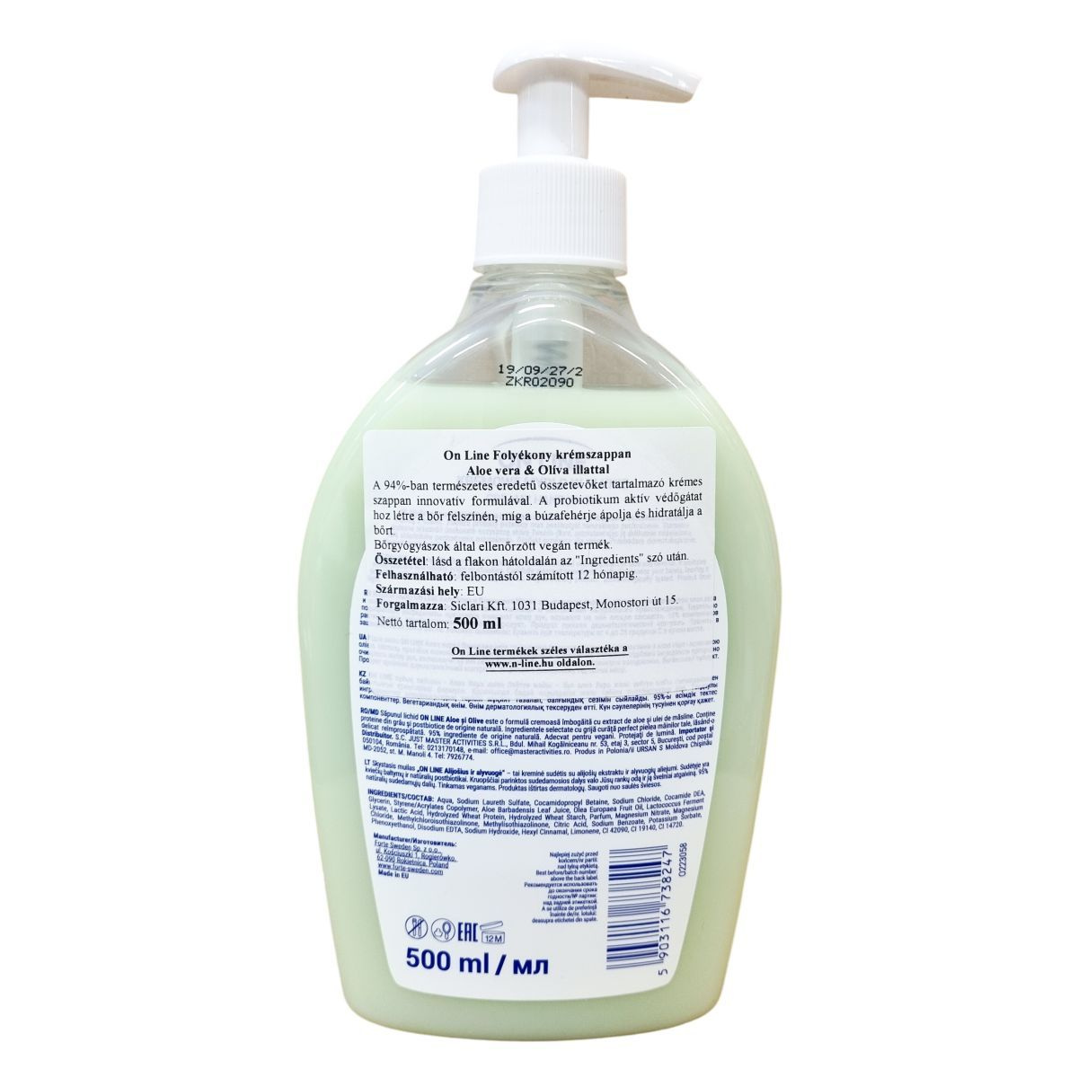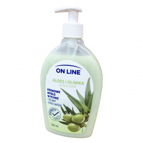 Az On Line Aloe vera & Oliva krémszappan 94%-ban természetes eredetű összetevőket tartalmazó, innovatív formula. A probiotikum aktív védőgátat képez a bőr felszínén, míg a búzafehérje ápolásával és hidratálásával járul hozzá a bőr egészségéhez. A termék bőrgyógyászok által ellenőrzött és vegán minősítésű. A folyékony krémszappan 500 ml kiszerelésben érhető el, és származási helye az Európai Unió.