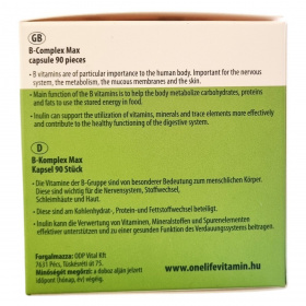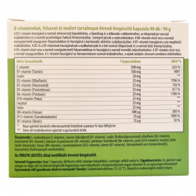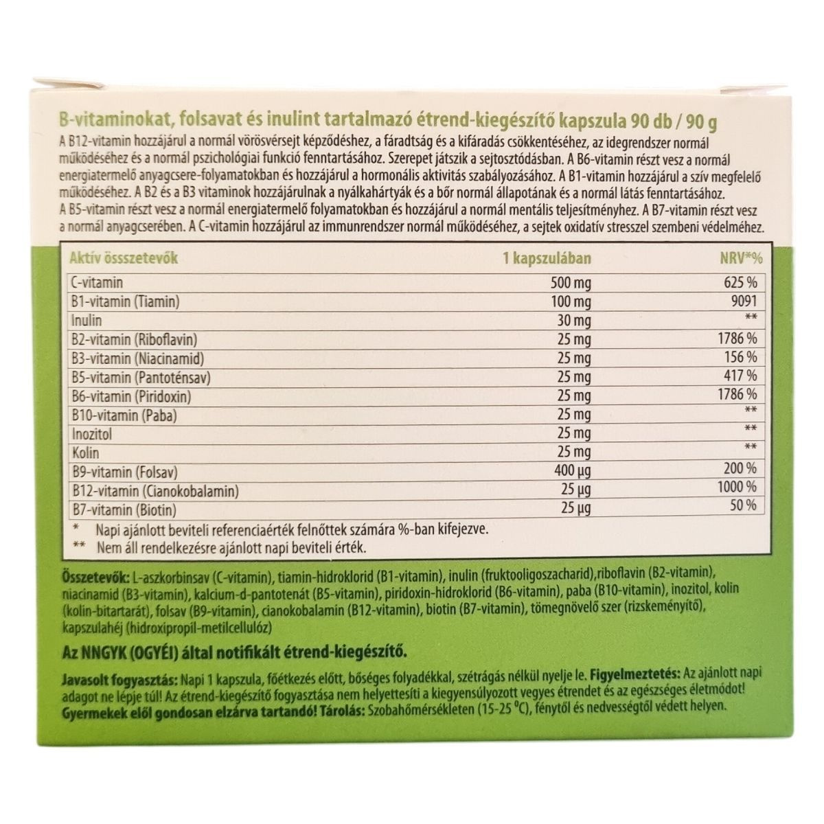 A B-vitaminok különösen fontosak az emberi szervezet számára, mivel szerepük lehet a szénhidrátok, fehérjék és zsírok anyagcseréjének elősegítésében, ezzel támogatva a táplálékból származó energia hasznosítását. Ezek a vitaminok hozzájárulhatnak a normál idegrendszeri működéshez, a nyálkahártyák és bőr egészségéhez, valamint számos anyagcsere-folyamathoz. Az inulin segítheti a vitaminok, ásványi anyagok és nyomelemek jobb hasznosulását és hozzájárulhat az emésztőrendszer egészséges működéséhez. A termék aktív összetevői között szerepelnek a különböző B-vitaminok (B1, B2, B3, B5, B6, B7, B9, B10, B12), folsav, C-vitamin, inulin, inozitol és kolin. A C-vitamin hozzájárulhat az immunrendszer normál működéséhez és a sejtek oxidatív stresszel szembeni védelméhez, míg a B-vitaminok többféle anyagcsere-folyamat támogatásában játszhatnak szerepet, például energiatermelésben, hormonális aktivitás szabályozásában és sejtosztódásban. A termék térfogata 90 kapszula, amelyeket napi egyszeri adagban, főétkezés előtt ajánlott bevenni bőséges folyadékkal. A kapszulák növényi eredetű bevonattal rendelkeznek, és rizskeményítő szolgál tömegnövelő szerként. A termék szobahőmérsékleten, fénytől és nedvességtől védett helyen tárolandó.