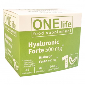 A Hyaluronic Forte 500 mg kapszula hialuronsavat, C-vitamint és inulint tartalmaz. A hialuronsav a bőr, kötőszövet, ízületi folyadék és porcszövet természetes alkotórésze, amely kiemelkedő képességgel rendelkezik nagy mennyiségű víz megkötésére. A C-vitamin hozzájárulhat a megfelelő kollagénképződéshez, támogatva ezzel a bőr és a porcok normál állapotát és működését, emellett az immunrendszer és a csontozat normál működésében is szerepet játszhat. Az inulin elősegítheti a vitaminok, ásványi anyagok és nyomelemek hatékonyabb hasznosulását. A termék kapszulában kerül forgalomba, és fogyasztása során fontos a megfelelő folyadékbevitel. Az érintettek kizárólag a csomagoláson jelzett mennyiséget fogyasszák, továbbá a termék nem helyettesíti a változatos étrendet és az egészséges életmódot.
