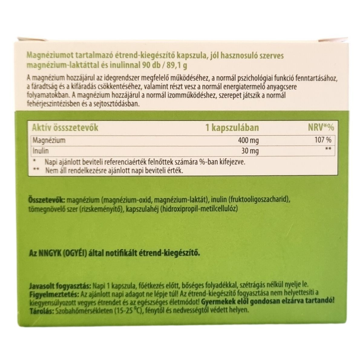 magnézium (magnézium-oxid, magnézium-laktát), inulin (fruktooligoszacharid), tömegnövelő szer (rizskeményítő), kapszulahéj (hidroxipropil-metilcellulóz)