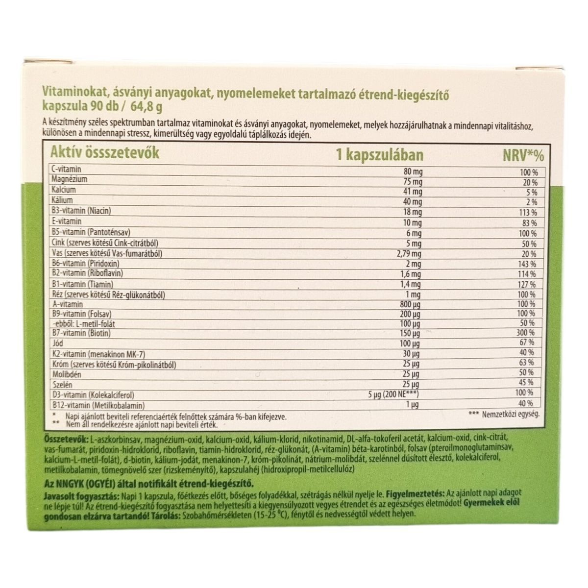 L-aszkorbinsav, magnézium-oxid, kalcium-oxid, kalcium-klorid, nikotinamid, Dl-alfa-tokoferil acetát, kalcium-oxid, cink-citrát, vas-fumarát, piridoxin-hidroklorid, riboflavin, tiamin-hidroklorid, réz-glükonát, (A-vitamin) béta-karotinból, folsav (pteroilmonoglutaminsav, kalcium-L-metil-folát), d-biotin, kálium-jodát, menakinon-7, króm-pikolinát, nátrium-molibdát, szelénnel dúsított élesztő, kolekalciferol, metilkobalamin, tömegnövelő szer (rizskeményítő), kapszulahéj (hidroxipropil-metilcellulóz)