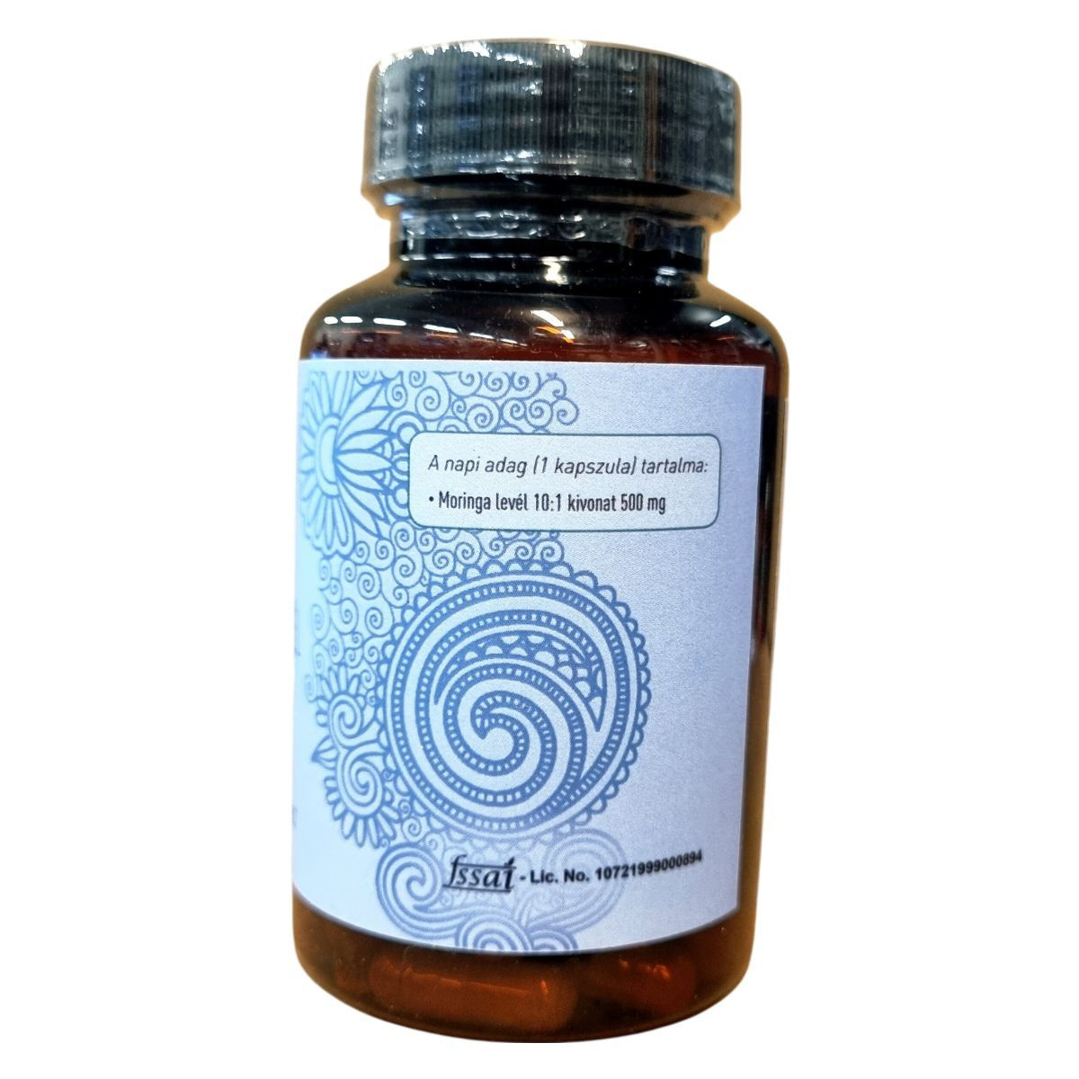 Gyógynövényes étrend-kiegészítő kapszula moringa levél őrlemény kivonatból.