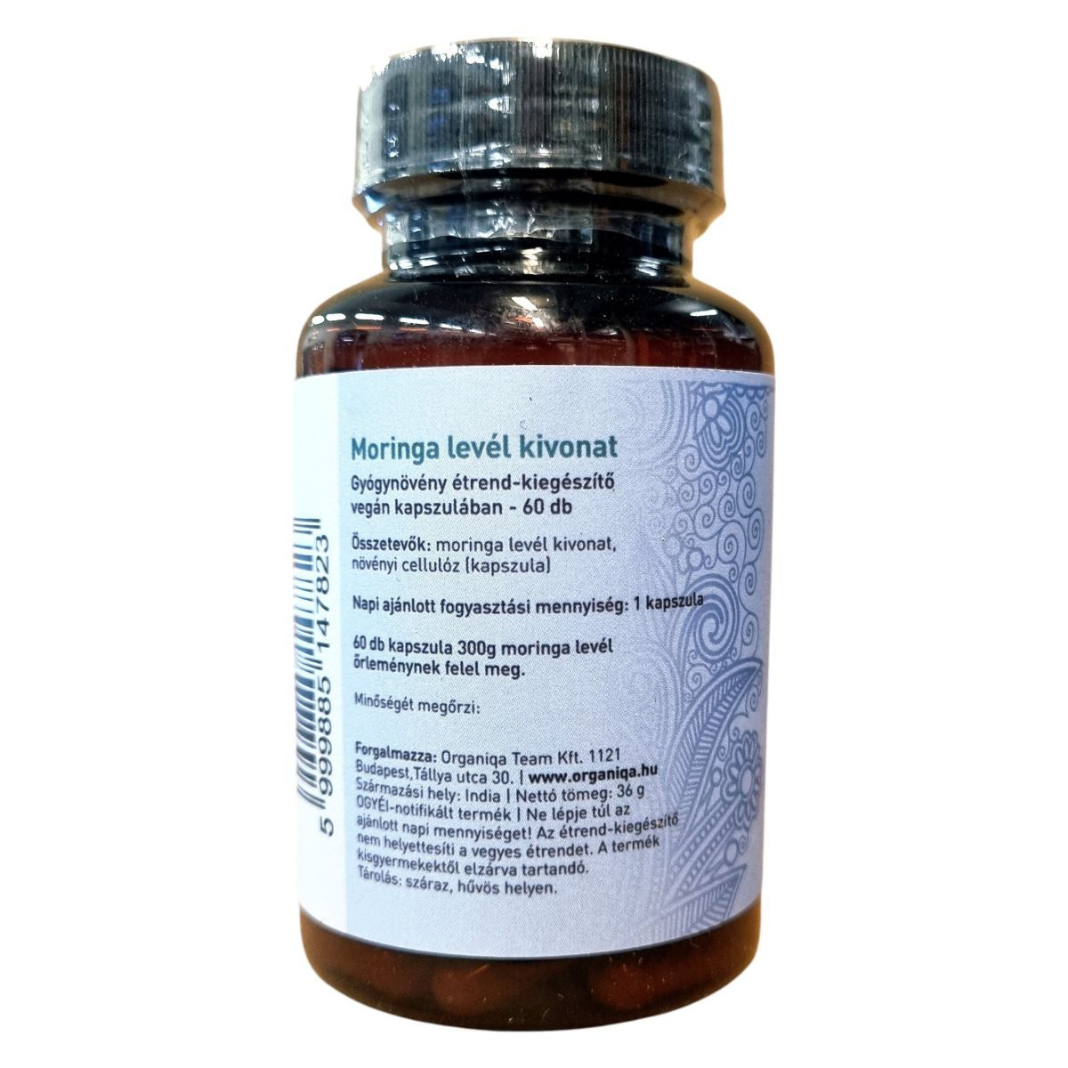 Az Organiqa Moringa levél kivonat egy gyógynövény alapú étrend-kiegészítő, amely Indiából származik. A termék 60 vegán kapszulát tartalmaz, amelyek mindegyike 500 mg moringa levél 10:1 kivonatot tartalmaz. A moringa levél gazdag tápanyagforrás lehet, és hozzájárulhat a szervezet általános jólétéhez. A termék forgalmazója az Organiqa Team Kft., és az OGYÉI-notifikált termékek közé tartozik. A kapszulák növényi cellulózból készülnek, így a termék vegán étrendbe is beilleszthető. Fontos, hogy a terméket száraz, hűvös helyen tároljuk, és ne lépjük túl az ajánlott napi mennyiséget.