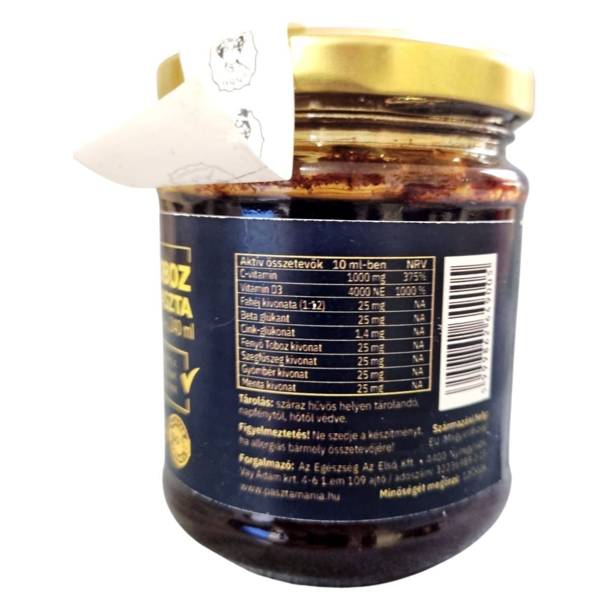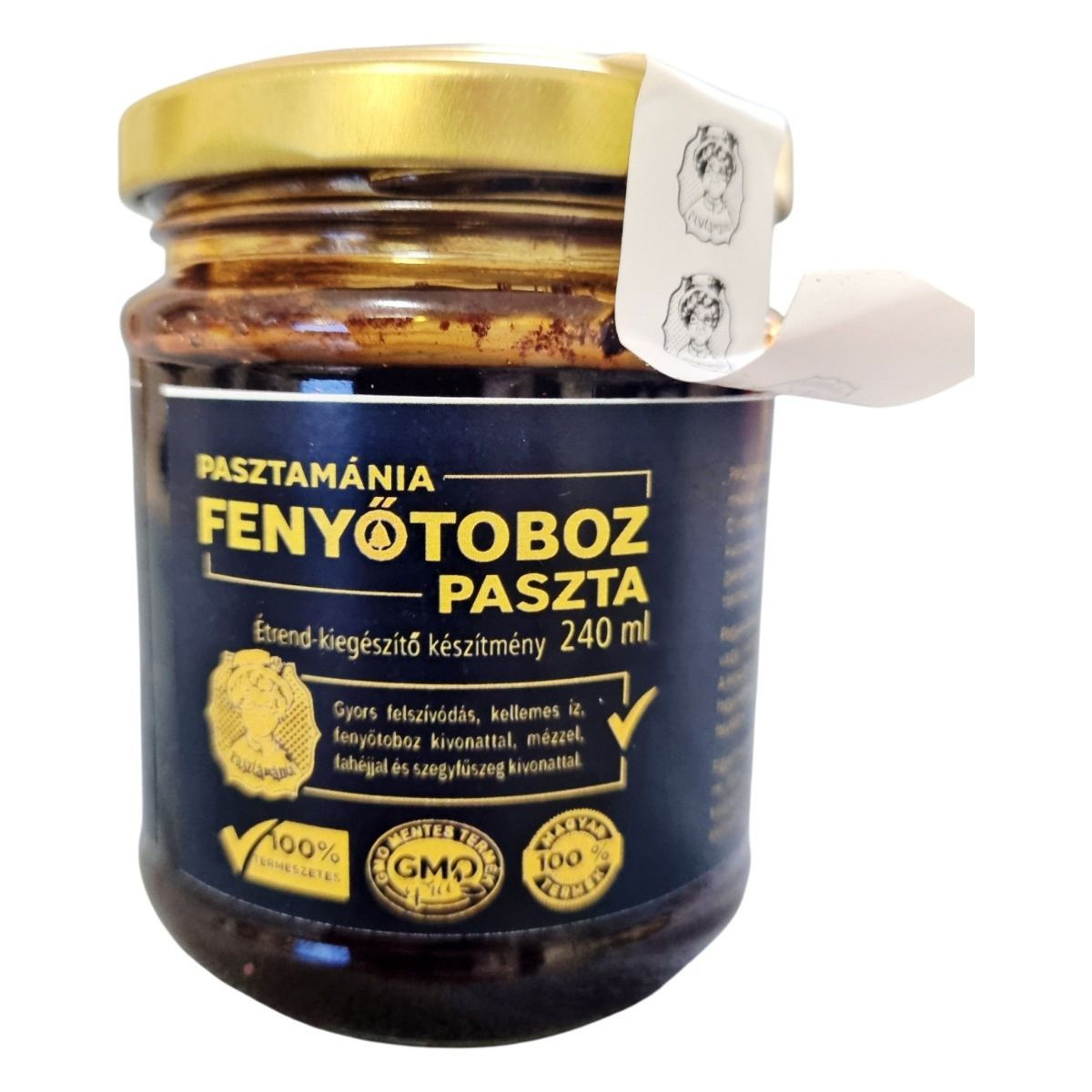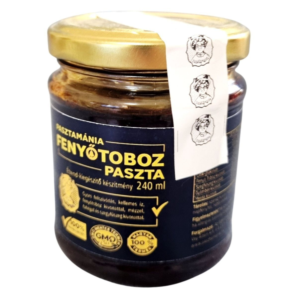 A Pasztamánia Fenyőtoboz Paszta egy 240 ml-es étrend-kiegészítő, amely természetes összetevőkből készült, mint a fenyőtoboz kivonat, méz, fahéj, szegfűszeg, gyömbér és menta. A termék GMO-mentes és magyar gyártású. A C-vitamin és D3-vitamin magas koncentrációja támogathatja az immunrendszer működését. A paszta kellemes ízű, gyorsan felszívódik, és napi egy kávéskanál fogyasztása javasolt. A termék legalább 6 hónapos folyamatos használata ajánlott, majd 1-2 hét szünet után folytatható. Fontos, hogy a terméket gyermekek elől elzárva tartsuk, és ne lépjük túl az ajánlott napi mennyiséget.