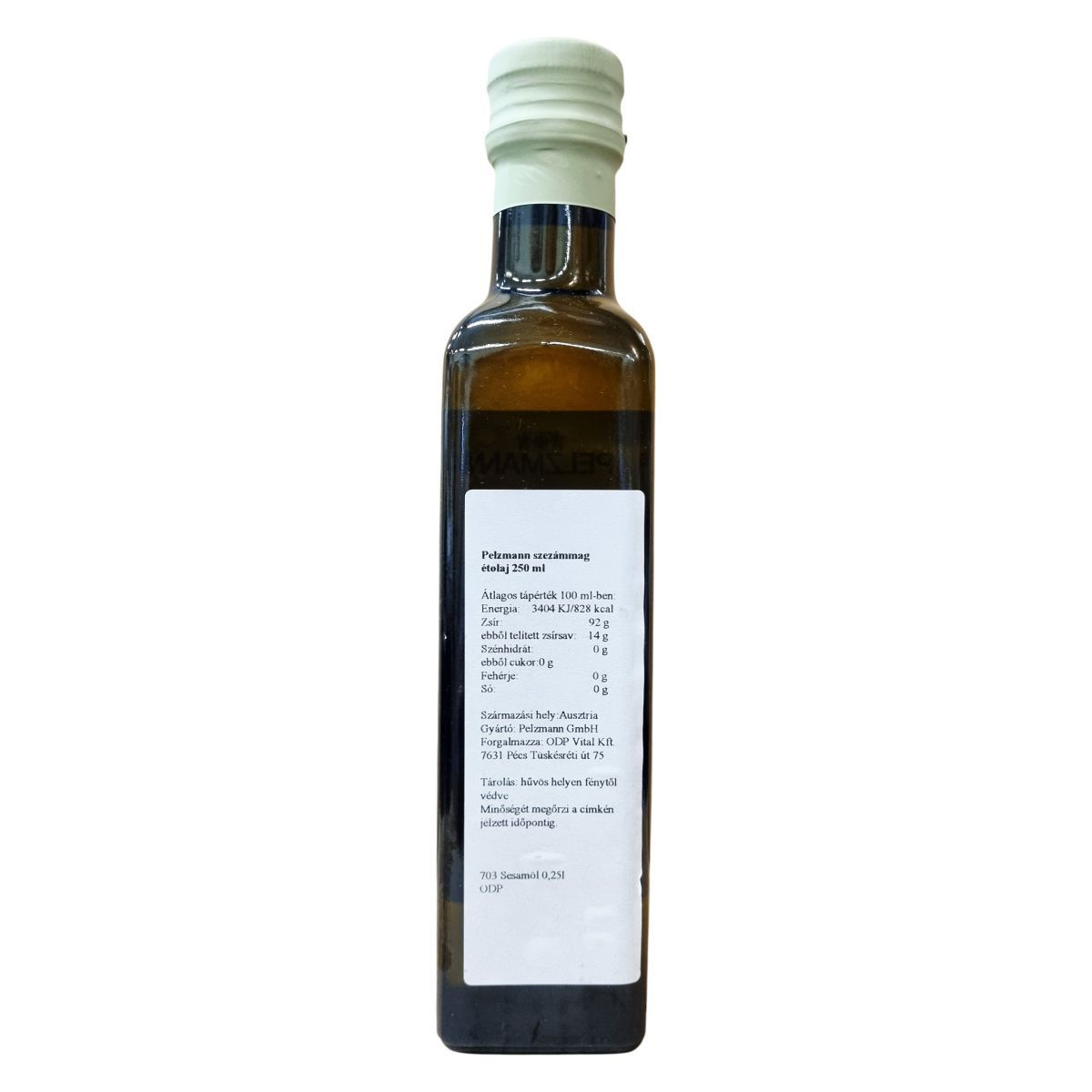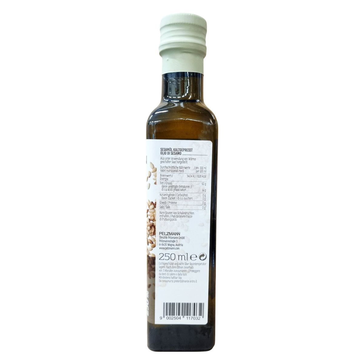 A Pelzmann szezámolaj az emberiség egyik legrégebbi olajnövényeiből készült, meleg alkalmazása mellett hántolt magból. Átlagos tápértéke 100 ml-ben 3404 kJ (828 kcal), magas zsírtartalmú, ebből 14 g telített zsírsavat tartalmaz. Szénhidrát, cukor, fehérje és só mennyisége nincs benne. A termék Ausztriából származik, és rejtett módon tartalmazhat maghéj maradványokat. A palack üvegből készült, kupakja fémből, kapszulája műanyagból áll, és az újrahasznosítás szabályainak megfelelően kell kezelni. A jellegzetes szezámíz miatt az olaj felhasználása főként ételek ízesítéséhez ajánlott, nem alkalmas fritőzben való használatra.
