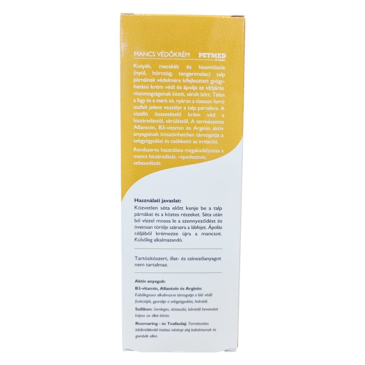 A PETMED dr.kelen Mancs védőkrém kutyák, macskák és kistestű emlősök talppárnáinak védelmére kifejlesztett készítmény. A vízálló összetételű krém védi és ápolja az időjárás viszontagságainak kitett bőrfelületet. Télen a fagy és a maró só, nyáron a forró aszfalt jelenthet veszélyt a talppárnákra. A természetes allantoin, B3-vitamin és arginin aktív anyagainak köszönhetően a készítmény támogathatja a bőr védőfunkcióját, segítheti a sebgyógyulást és csökkentheti az irritációt. Rendszeres használata hozzájárulhat a mancs kiszáradásának, repedezésének és sebesedésének megelőzéséhez. Tartósítószert, illat- és színezőanyagot nem tartalmaz.