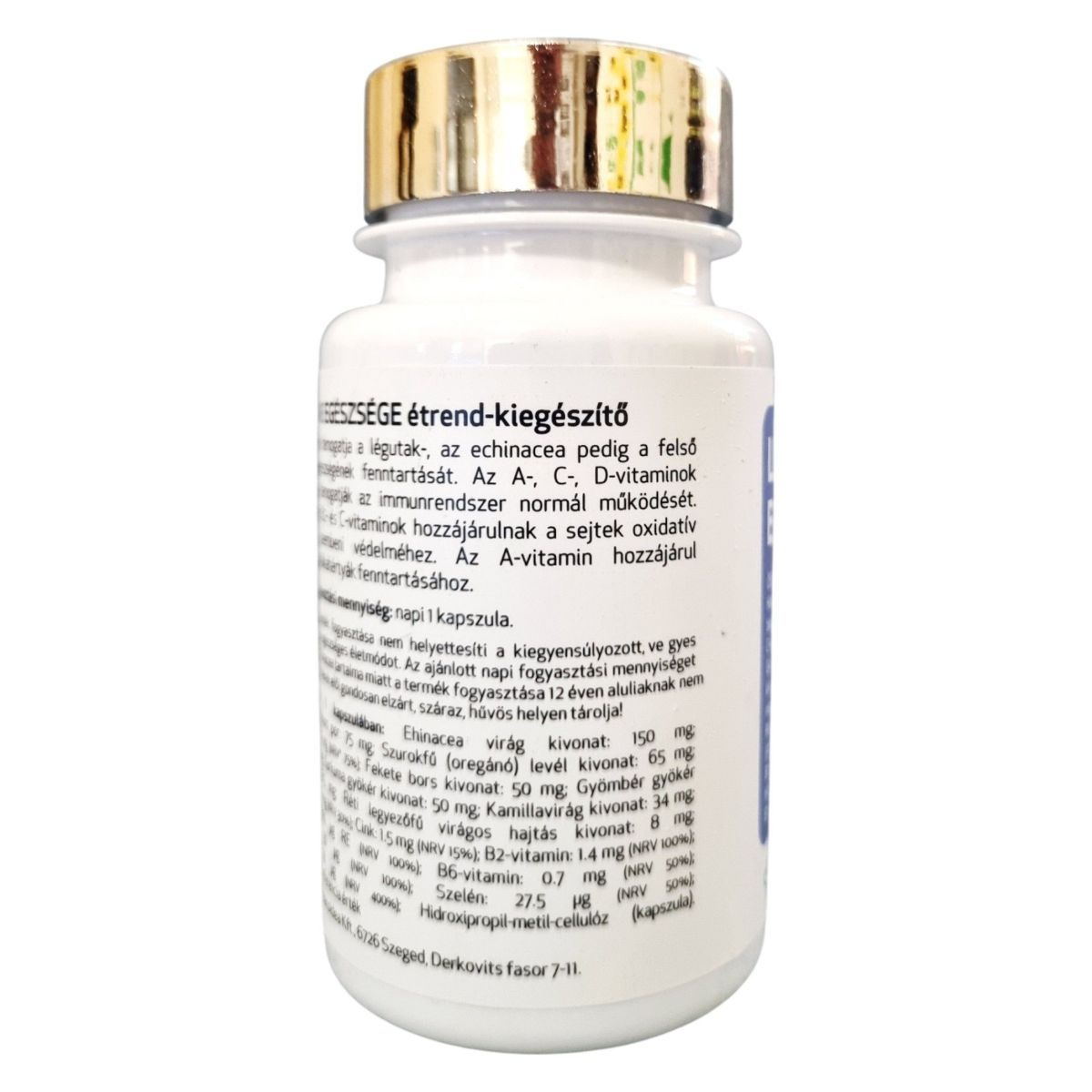 A LÉGUTAK EGÉSZSÉGE étrend-kiegészítő a légutak és az immunrendszer támogatására lett kifejlesztve. Az echinacea és a gyömbér hozzájárulhatnak a légutak egészségének fenntartásához, míg az A-, C-, D-vitaminok és a cink az immunrendszer normál működését támogathatják. A szelén, a B2- és C-vitaminok antioxidáns hatásukkal segíthetnek a sejtek oxidatív stresszel szembeni védelmében. Az A-vitamin a normál nyálkahártyák fenntartásához járulhat hozzá.