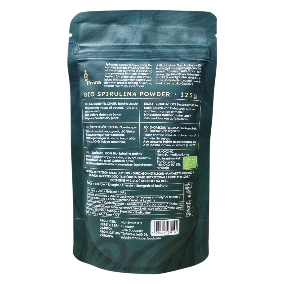 Összetevők: 100% bio spirulina algapor. Egyéb allergének: Nyomokban földimogyorót, dióféléket és szezámmagot tartalmazhat. Származási hely: Kína.
