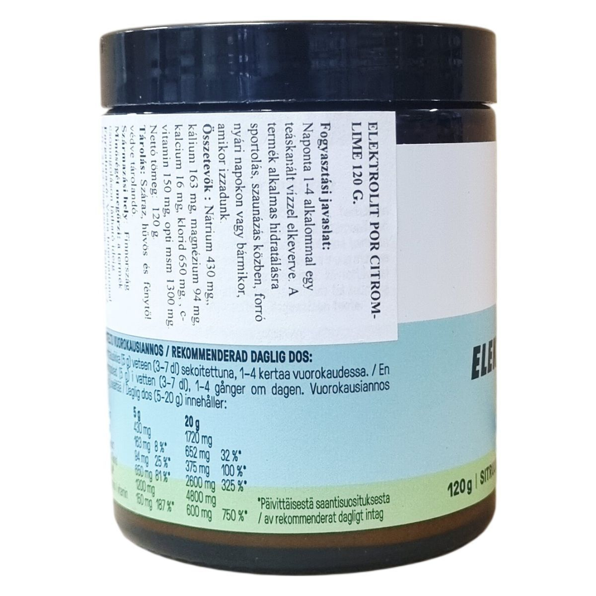 Citrom és lime ízű elektrolitpor. Édesítőszert (szteviol-glikozidok) tartalmaz. Fő összetevő származási helye: Európai Unión kívüli. Gyártva Finnországban. Nettó tömeg: 120 g. 24 adag. Vonalkód: 6430039222601.