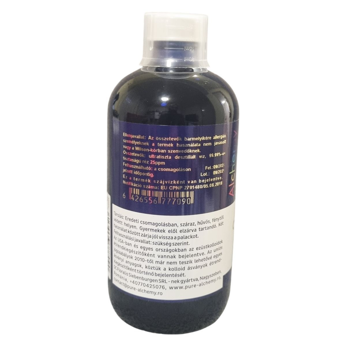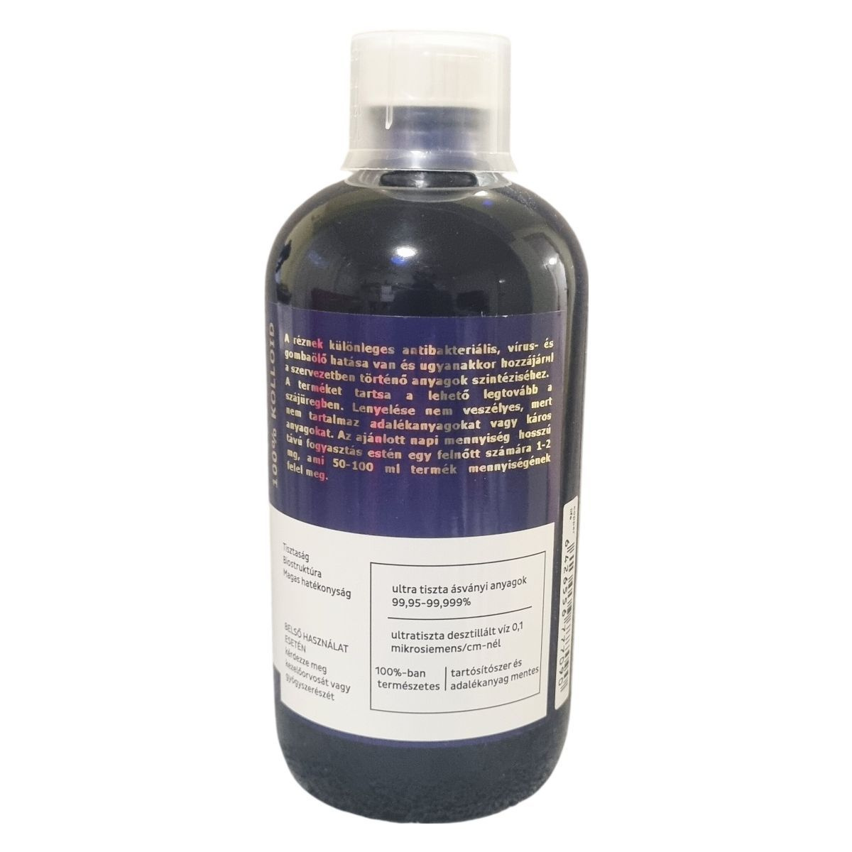 A termék természetes kolloid rézoldat, amely antibakteriális, vírus- és gombaölő hatással támogatja a szervezet anyagcseréjét és egészségét.