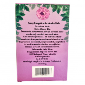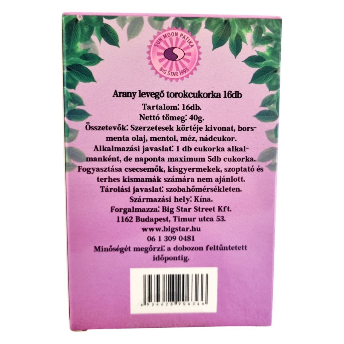 Az Arany levegő torokcukorka egy különleges termék, amely 16 darab cukorkát tartalmaz. A termék összetevői között megtalálható a szerzetesek körtéje kivonat, borsmenta olaj, mentol, méz és nádcukor. A termék alkalmazása során javasolt, hogy egyszerre csak egy cukorkát fogyasszunk, és naponta ne lépjük túl az 5 darabos mennyiséget. A termék fogyasztása nem ajánlott csecsemők, kisgyermekek, szoptató és terhes kismamák számára. A cukorkákat szobahőmérsékleten érdemes tárolni. A termék Kínából származik, és a Big Star Street Kft. forgalmazza.