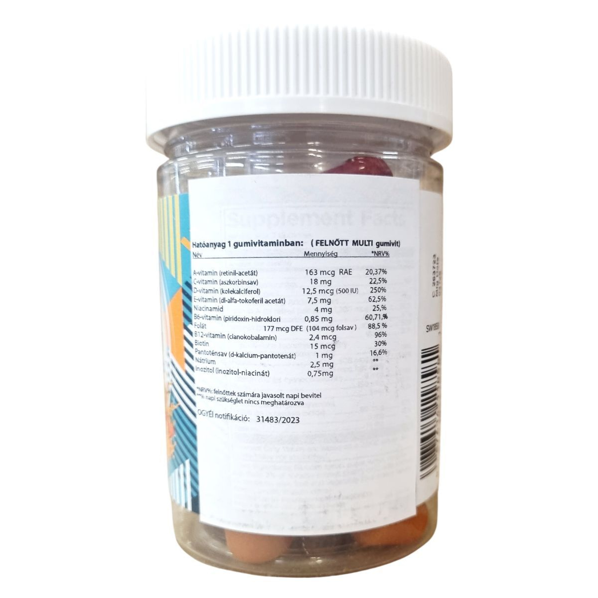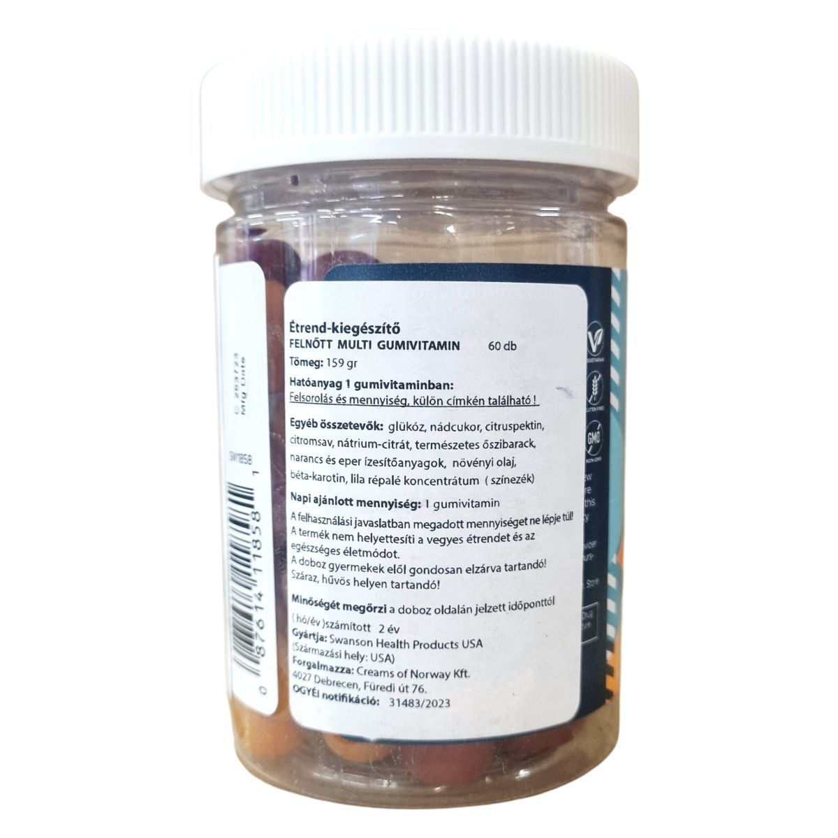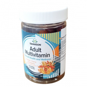 A Swanson Adult Multivitamin Overall Health and Wellness gumivitamin egy felnőttek számára készült étrend-kiegészítő, amely 60 darab finom gumivitamint tartalmaz narancs, cseresznye és eper ízesítéssel, valamint egyéb természetes aromákkal. A termék különféle vitaminokat, mint például A-, C-, D-, E- és B-vitaminokat, valamint niacinamidot, folsavat, biotint, pantoténsavat, nátriumot és inozitolt tartalmaz. A készítmény vegetáriánus étrendbe illeszthető, valamint gluténmentes, így különböző táplálkozási igényekhez igazodik. Egy gumivitamin energia- és tápérték adata nincs megadva. A termék összetevői között megtalálhatóak a természetes gyümölcsaromák, növényi olaj és természetes színezékek, így ízletes és színes formában egészítheti ki a napi vitaminbevitelt. A terméket kizárólag a javasolt adagolás szerint szabad fogyasztani, és nem helyettesíti a változatos étrendet és az egészséges életmódot. Tárolása során száraz, hűvös helyet kell biztosítani, és gyermekek elől elzárva tartandó. A készítményt az USA-ban gyártják, forgalmazza a Creams of Norway Kft., OGYÉI notifikációval rendelkezik.