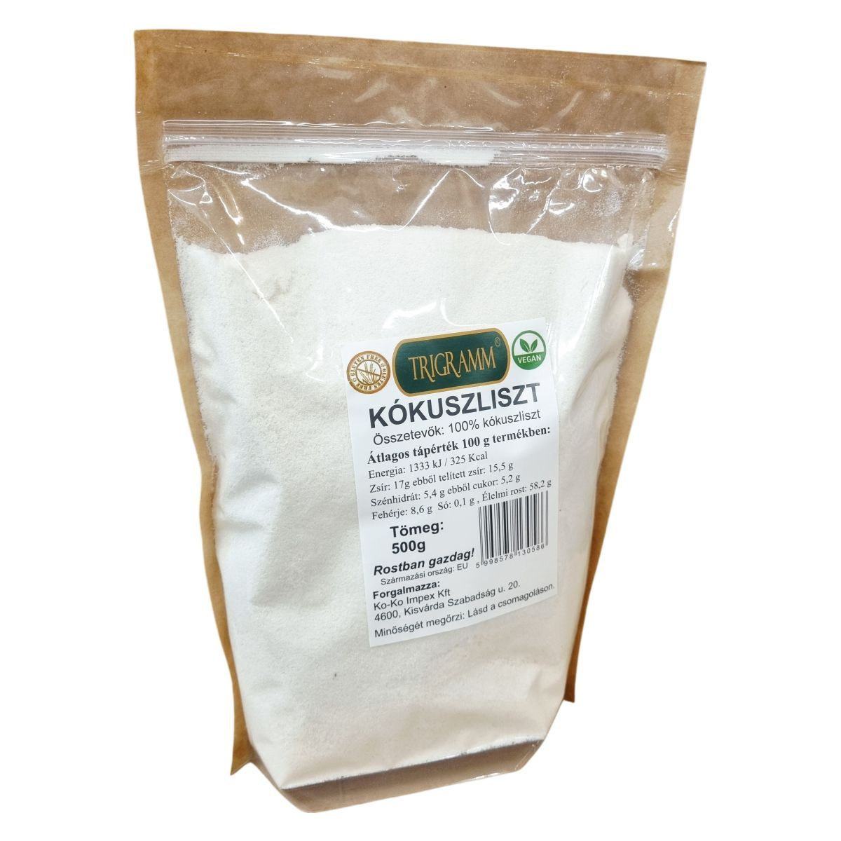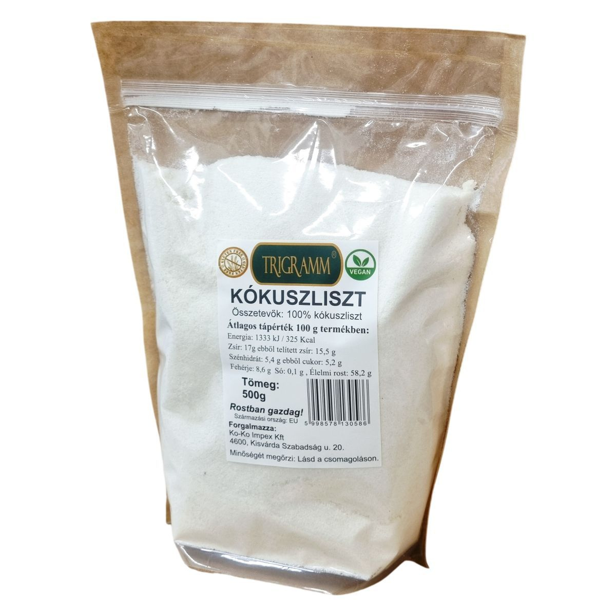A termék EU-ból származik, rostban gazdag kókuszliszt, amely ideális választás lehet a vegán étrendet követők számára. Tele van tápanyagokkal, alacsony cukortartalommal és magas fehérje- valamint rosttartalommal. Használata széles körben alkalmazható a konyhában.