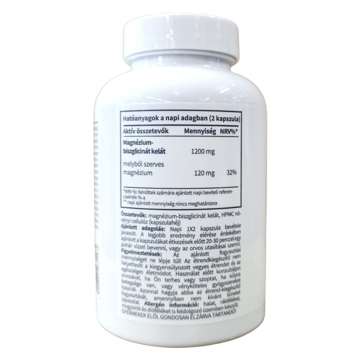 magnézium-biszglicinát kelát, HPMC növényi cellulóz (kapszulahéj)
