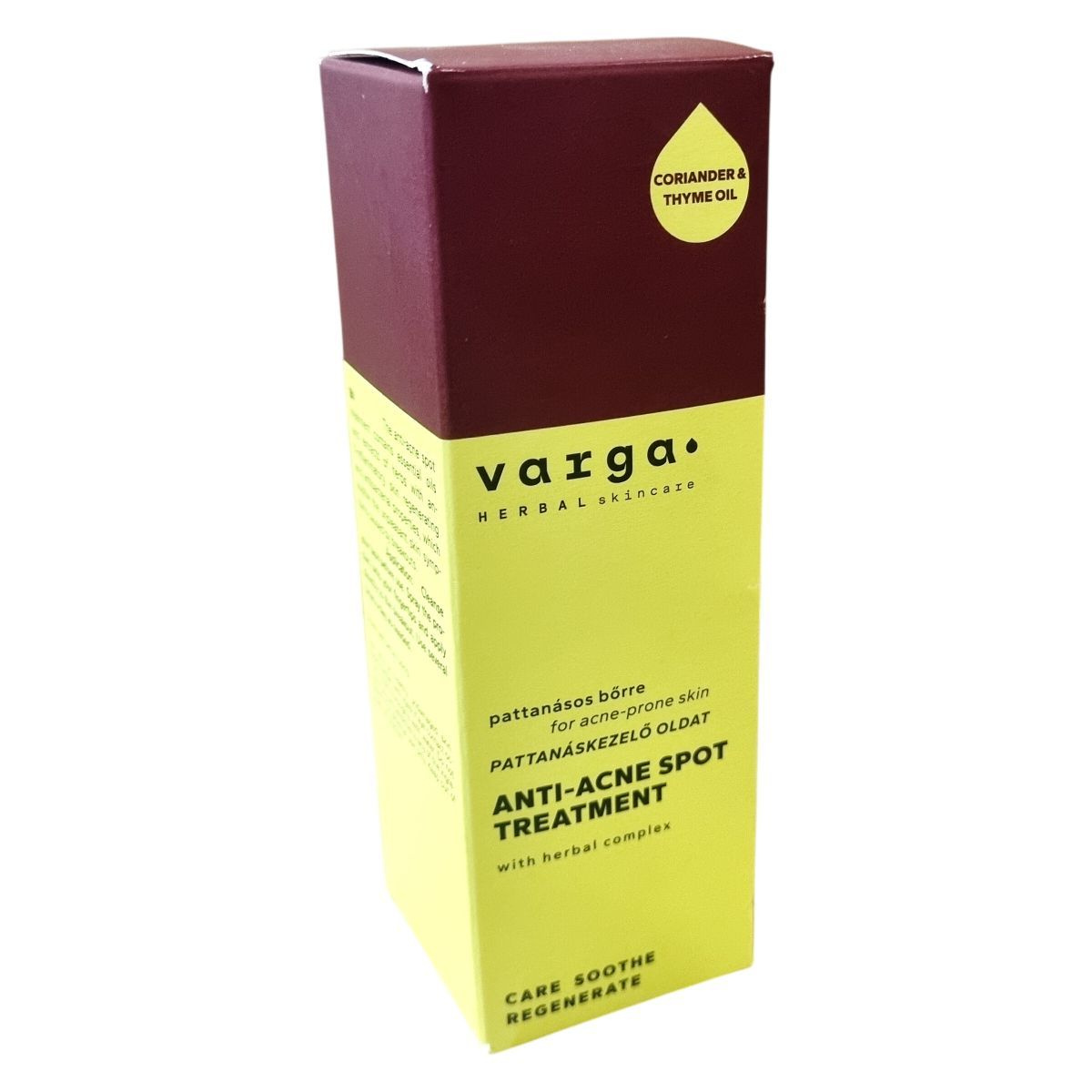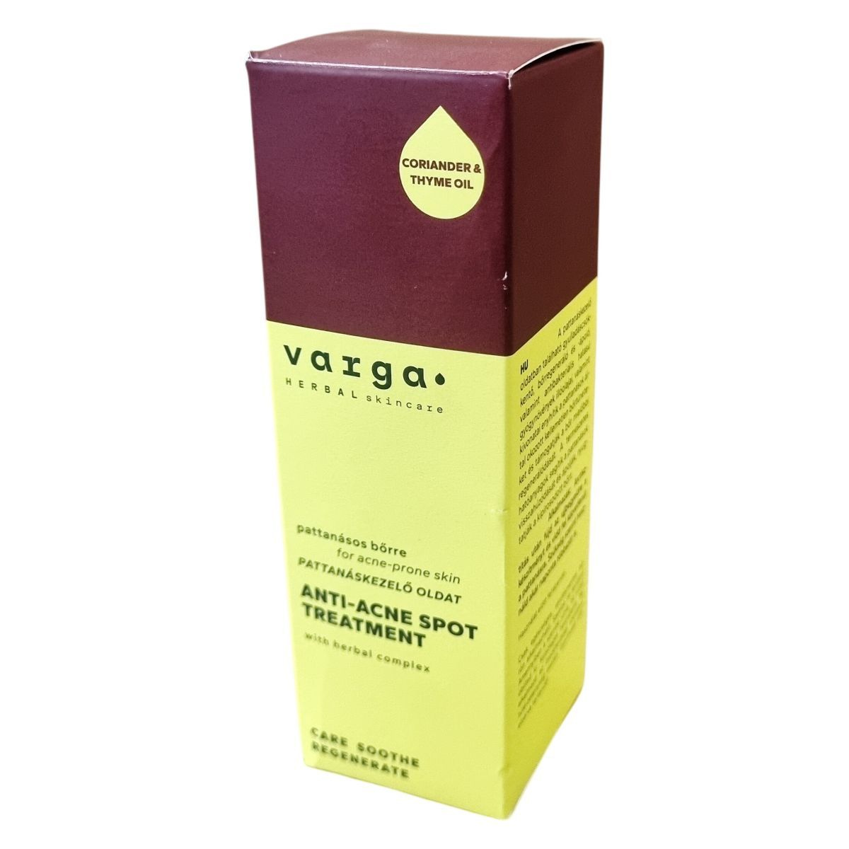 A CORIANDER & THYME OIL pattanáskezelő oldat természetes gyógynövények illóolajait és kivonatait tartalmazza, melyek gyulladáscsökkentő, bőrregeneráló és antibakteriális hatással rendelkeznek. Enyhítik a pattanások okozta kellemetlen bőrtüneteket, nyugtatják a kipirosodott bőrt és elősegítik a bőr mihamarabbi regenerálódását. Az üveg, a papírdoboz és a címke külön-külön újrahasznosítható. A termék használata során fontos a felrázás, és kizárólag ép, sérülésmentes bőrre ajánlott. A termék 50 ml kiszerelésű, és csak külső használatra alkalmas.