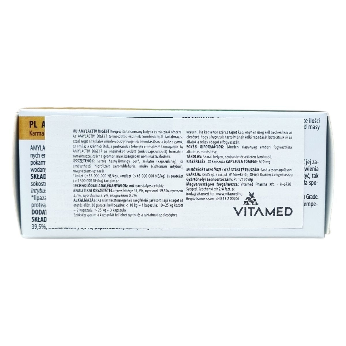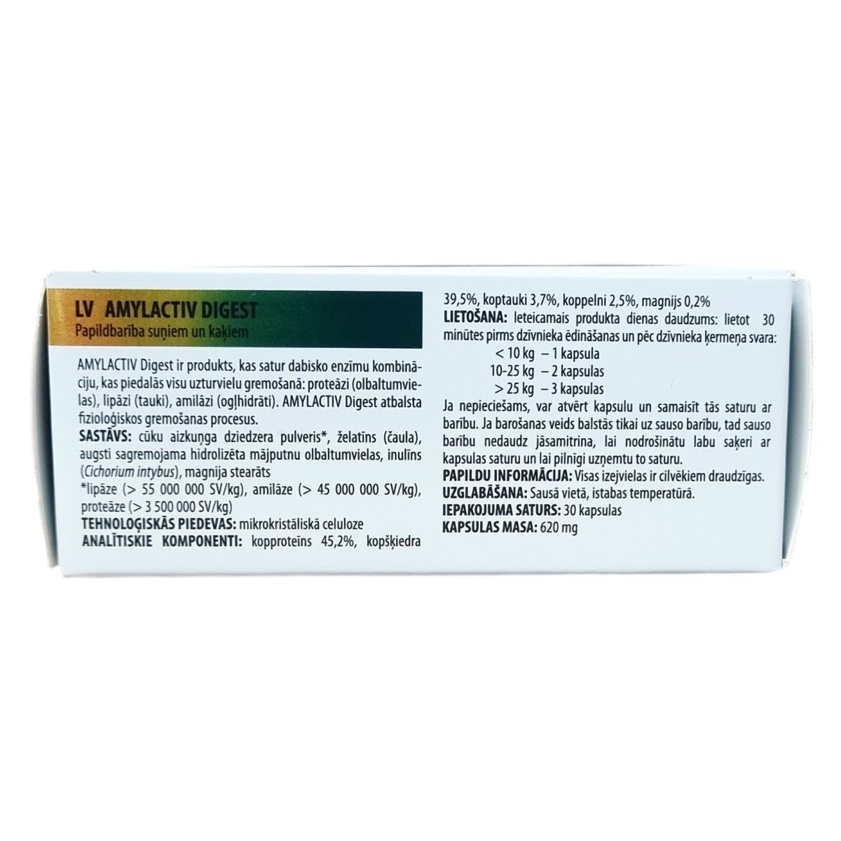 Az Amylactiv Digest természetes enzimek kombinációját tartalmazza (lipáz, amiláz, proteáz), amelyek támogathatják a zsírok, szénhidrátok és fehérjék emésztését. Az enzimeket védett, mikrokapszulázott formában tartalmazza, így azok a gyomor savas közegében nem inaktiválódnak. Szükség szerint a kapszula felnyitható és tartalma az eleséghez keverhető. Ha az állat száraz tápot kap, érdemes azt enyhén megnedvesíteni a kapszula tartalmának megfelelő tapadása érdekében. Minden alapanyag emberi fogyasztásra alkalmas minősítésű.