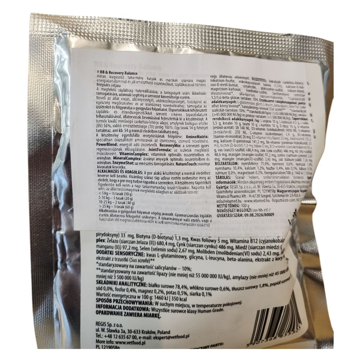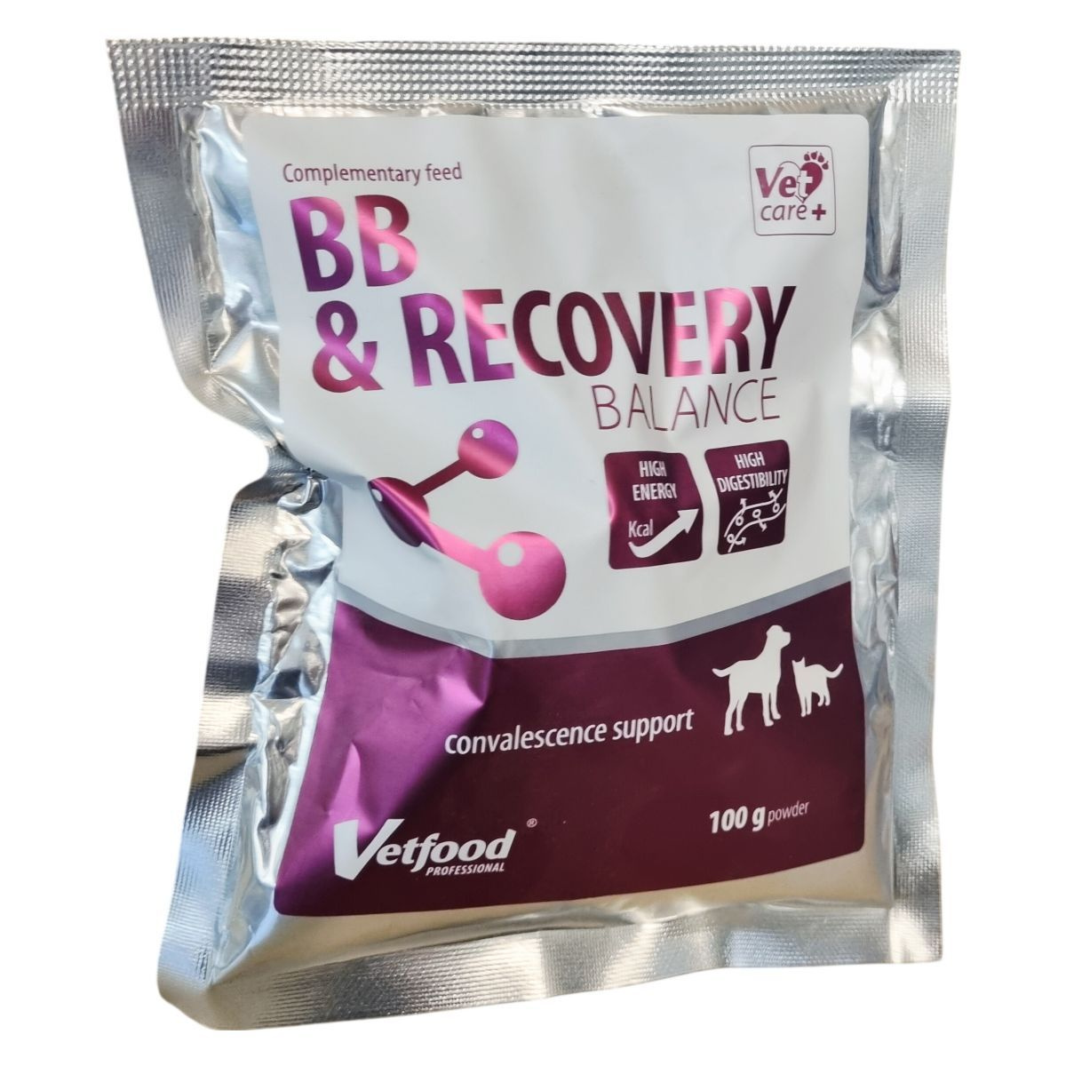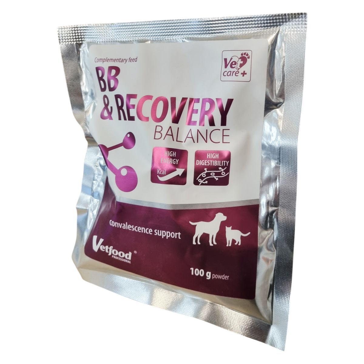 A Vetfood BB & Recovery Balance táplálékkiegészítő kutyák és macskák számára készült, kimondottan a szervezet kimerültsége és betegségek utáni lábadozás támogatására. Magas energiát és kiváló emészthetőséget biztosít csirkehús-fehérje alapanyagával, melynek biológiai értéke 56%, emészthetősége pedig 100%. A csomagolás 100 g port tartalmaz, amelynek magas fehérjetartalma (14 g tasakonként) egyenértékű a normál eledelben található mennyiséggel. Speciális formulája több komponensből áll: AminoMatrix aminosav-keverék segíti az izomtömeg és izomerő növelését, PowerBlend energiát adó anyagokból áll, RecoveryMix a gyors regeneráció támogatására szolgál, JointFormula hozzájárul az ízületek működéséhez, VitaminComplex és MineralComplex az optimális vitamin- és ásványianyag-ellátást biztosítja, EnzymeShot az emésztést támogatja, míg NatureTouch növényi kivonatok keveréke egészíti ki az összetételt. A készítmény tartalmaz továbbá olyan összetevőket, mint glükozamin-szulfát, kondroitin-szulfát, Saccharomyces cerevisiae élesztőkivonat, alfa-lipoinsav és nátrium-hialuronát. Minden alapanyaga emberi fogyasztásra alkalmas minősítésű. A termék használata a gyógyulási folyamatot segítheti, de alkalmazása előtt szakértő véleménye javasolt, különösen gyomorszonda táplálás esetén.